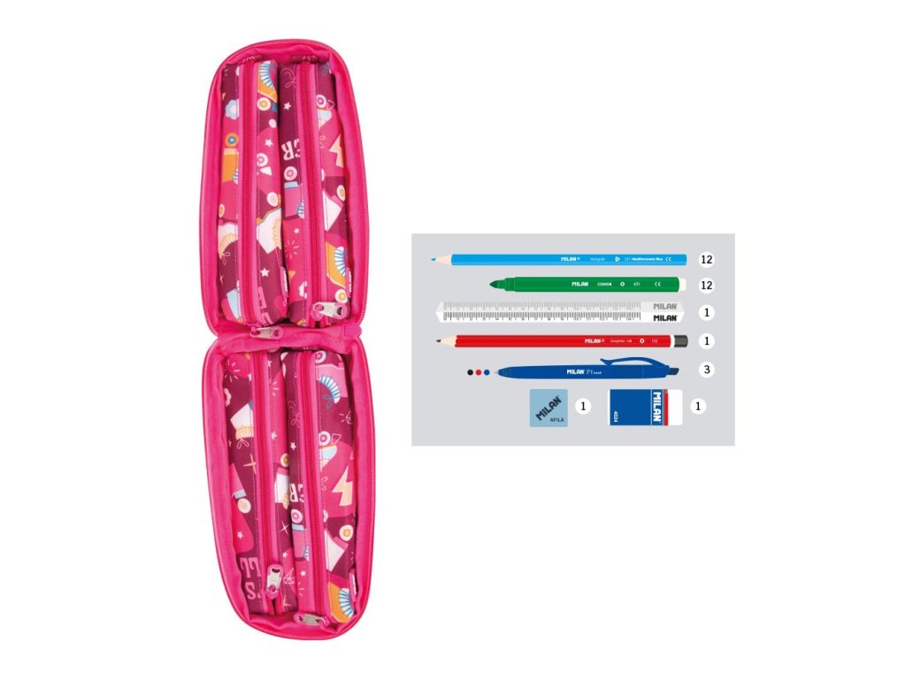 2. pouzdro obsahuje volně ložená barevná pera 3 ks, tužku HB a pravítko s trojúhelníkovým tělem