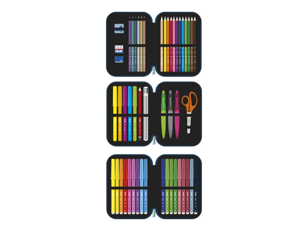 Třípatrový penál, který vám umožní mít školní potřeby vždy uklizené a snadno dostupné. Obsah penálu: 1 guma 4024 1 struhadlo AFILA 1 grafitová tužka HB 3 kuličková pera CAPSULE (modrá, zelená a červená) 1 trojúhelníkové pravítko 15 cm 12 trojúhelníkových pastelek 6 metalických tužek 5 zvýrazňovačů 1 základní nůžky 18 fixůDoplňkové parametry