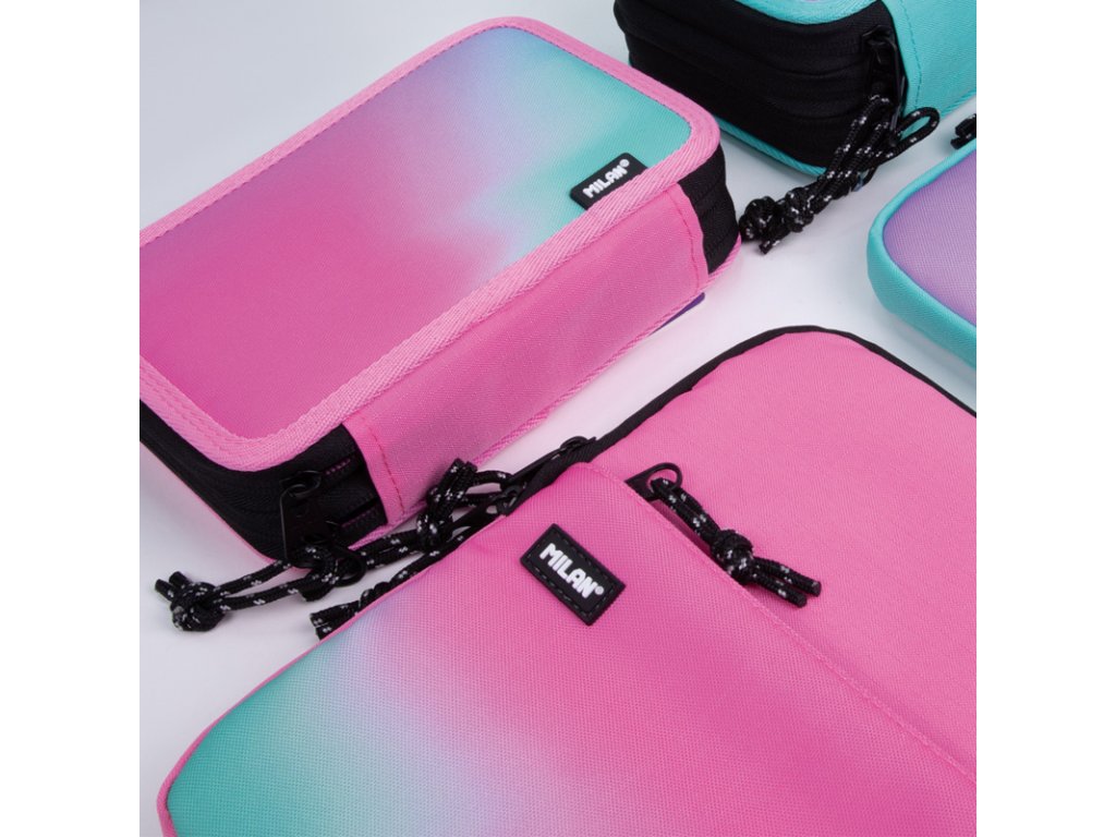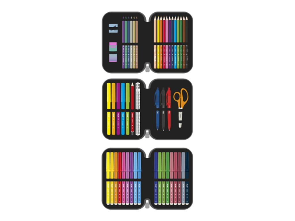 Třípatrový penál, který vám umožní mít školní potřeby vždy uklizené a snadno dostupné. Série Sunset, růžová barva. Kombinace přechodových barev inspirovaných západem slunce s černobílými detaily. Stahovák zipu se šňůrkou. Včetně školních potřeb: 2 gumy (4024 a růžová nata® 320 Sunset), 1 ořezávátko AFILA, 1 grafitová tužka HB, 3 pera CAPSULE (zelená, černá a červená), 1 trojúhelníkové pravítko 15 cm, 12 trojúhelníkových barevných tužek, 6 černých dřevěné kovové barevné tužky, 5 zvýrazňovačůDoplňkové parametry
