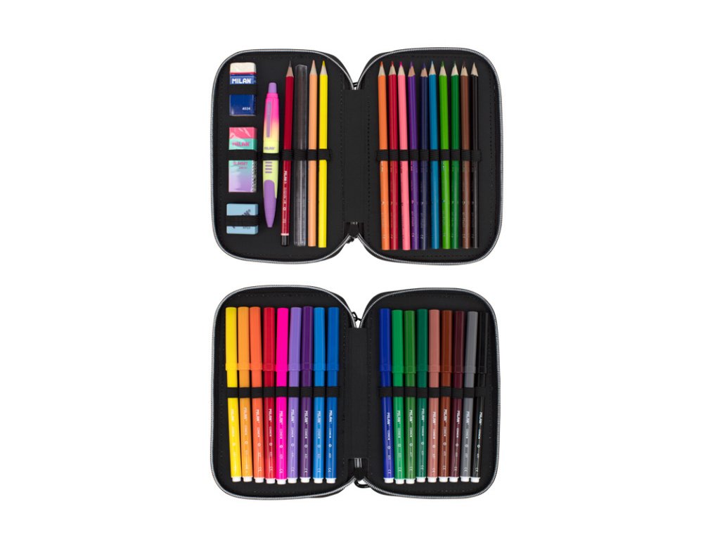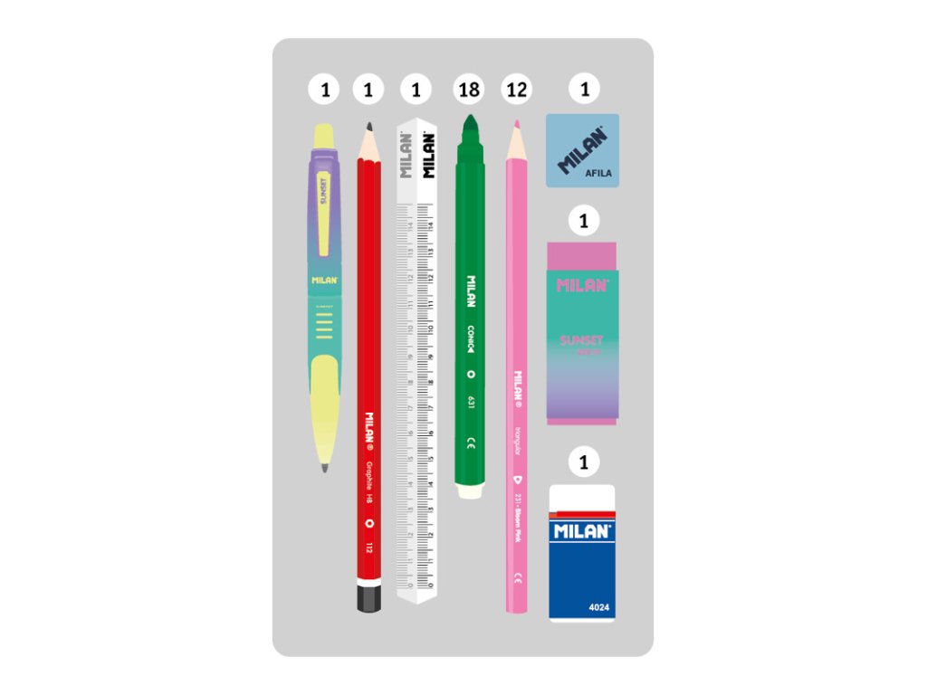 Penál MILAN Sunset (západ slunce) 2 patrový, naplněný. Obsah penálu: 18 fixů s kónickou špičkou 12x trojúhelníkové barevné tužky 1x kuličkové pero (modré) 1x HB grafitová tužka 1x pravítko 15 cm 1x AFILA struhadlo 2x syntetická guma Hmotnost: 0,48 kgDoplňkové parametry