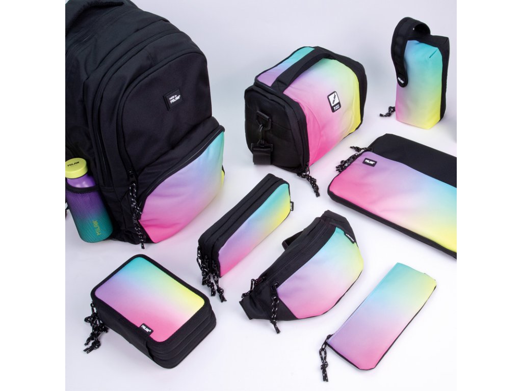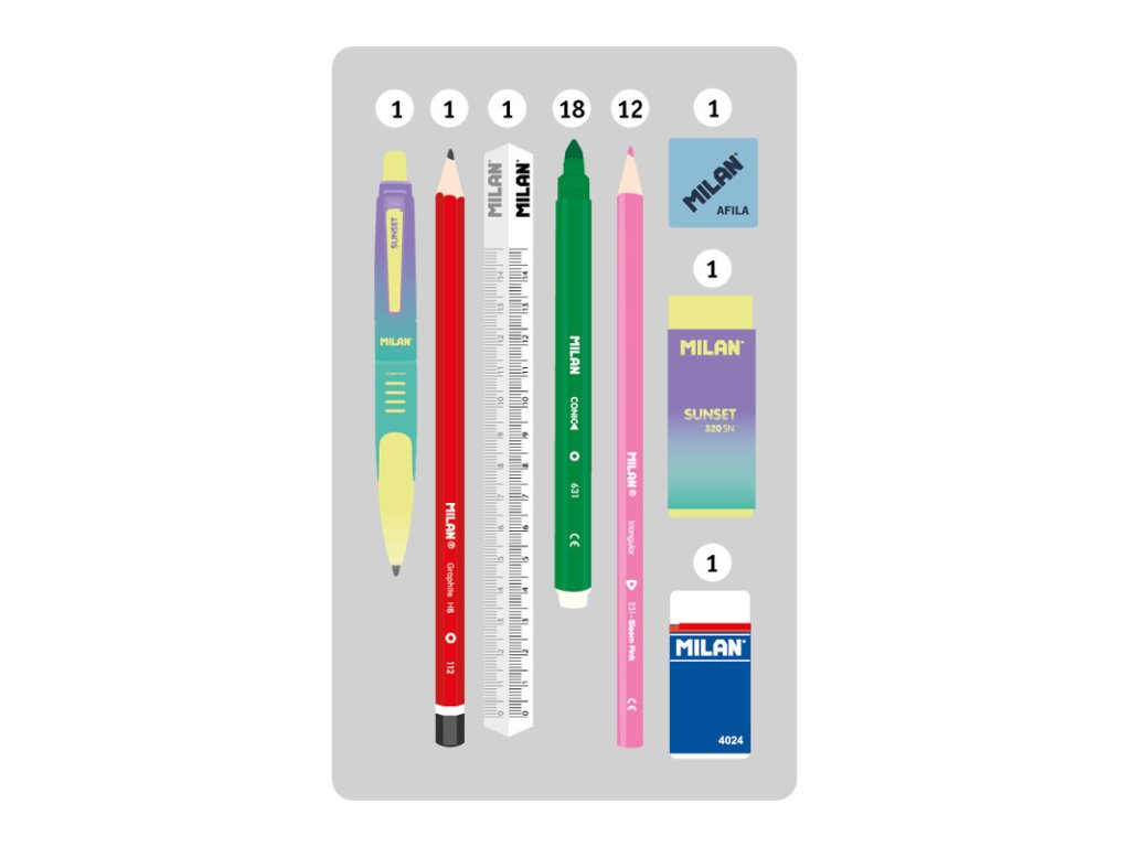 Penál MILAN Sunset (západ slunce) 2 patrový, naplněný. Obsah penálu: 18 fixů s kónickou špičkou 12x trojúhelníkové barevné tužky 1x kuličkové pero (modré) 1x HB grafitová tužka 1x pravítko 15 cm 1x AFILA struhadlo 2x syntetická guma Hmotnost: 0,48 kgDoplňkové parametry
