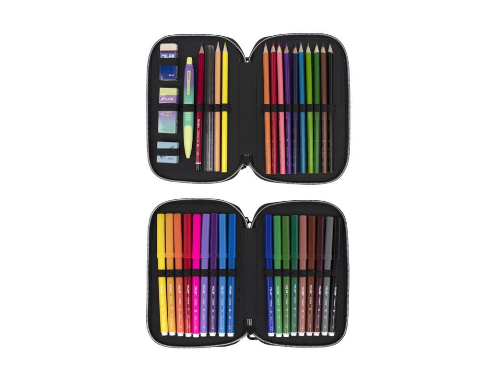 Penál MILAN Sunset (západ slunce) 2 patrový, naplněný. Obsah penálu: 18 fixů s kónickou špičkou 12x trojúhelníkové barevné tužky 1x kuličkové pero (modré) 1x HB grafitová tužka 1x pravítko 15 cm 1x AFILA struhadlo 2x syntetická guma Hmotnost: 0,48 kgDoplňkové parametry