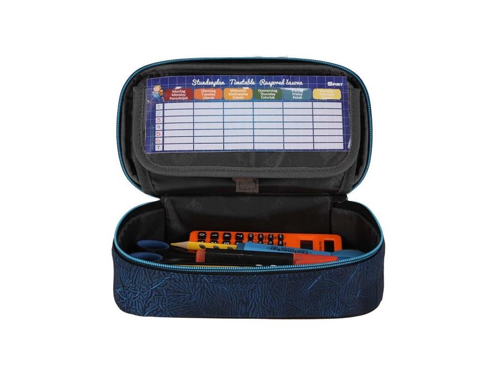 1 - zipový penál s výklopnou plochou na pastelky, fixy. Uvnitř je kapsička se zipem a rozvrh hodin. Penál je prázdný, fotografie jsou ilustrační. Materiál: PolyesterDoplňkové parametry