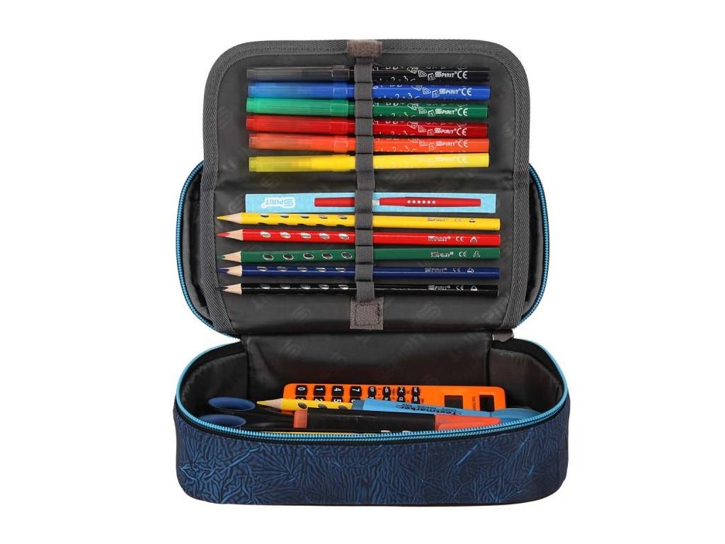 1 - zipový penál s výklopnou plochou na pastelky, fixy. Uvnitř je kapsička se zipem a rozvrh hodin. Penál je prázdný, fotografie jsou ilustrační. Materiál: PolyesterDoplňkové parametry