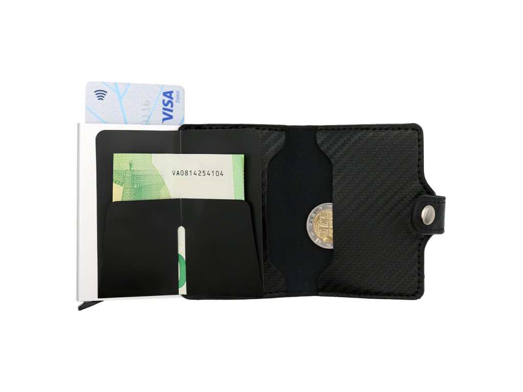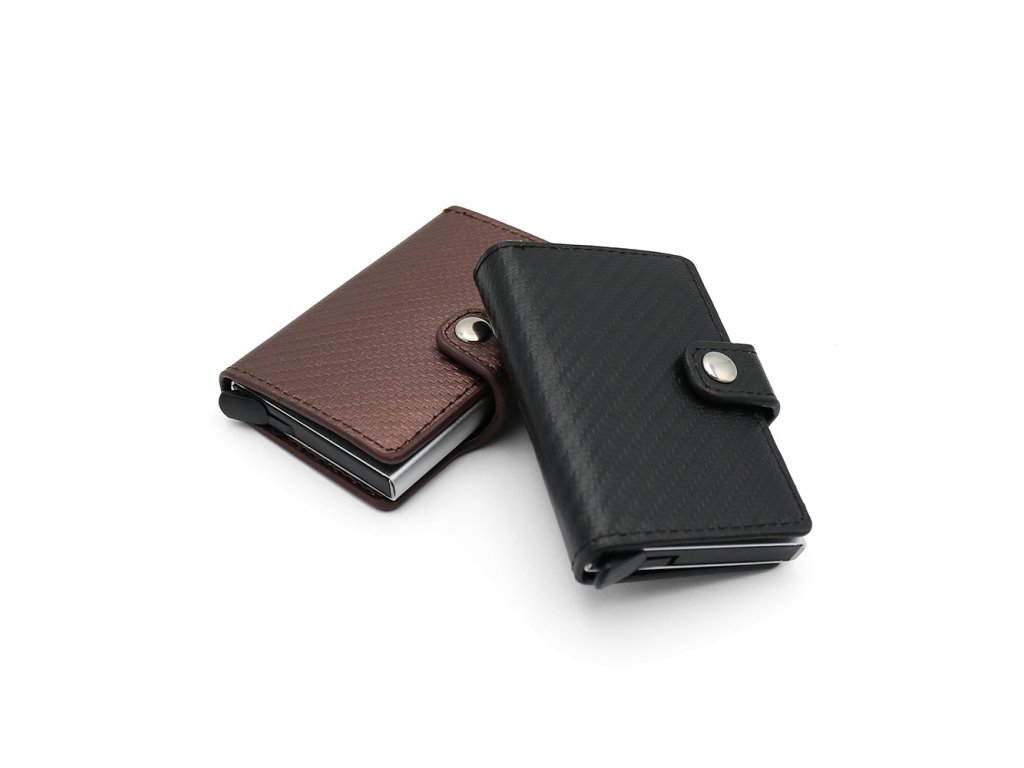 Pouzdro na karty z PU, schránka z hliníkové slitiny s výsuvným mechanismem.