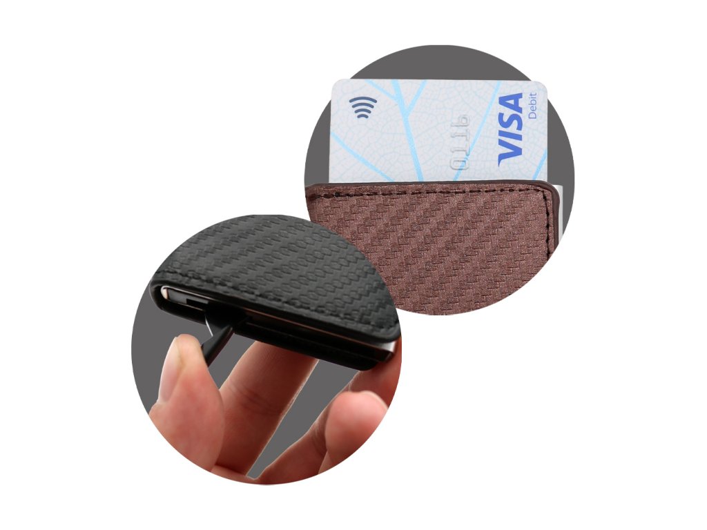 Pouzdro na karty z PU, schránka z hliníkové slitiny s výsuvným mechanismem.