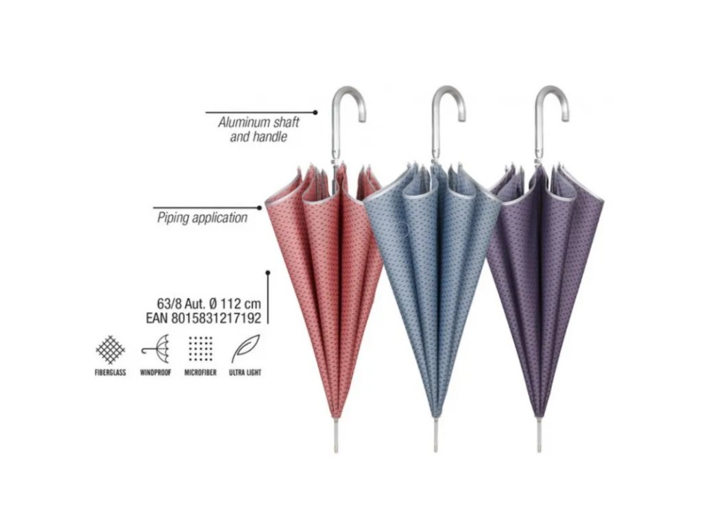Luxusní a jedinečné deštníky italské značky PERLETTI jsou kvalitní, originální i odvážné zároveň. Jsou vyrobeny z kvalitních materiálů, které s lehkostí odolávají všem nástrahám přírodních živlů. • automatické otevírání • průměr nataženého deštníku je 112cm, hmotnost 458g • materiál: 100% polyester - kvalitní potah s teflonovou úpravou • větruodolný - konstrukce je vyrobena ze speciálního sklolaminátového materiálu, který je pružný a odolný i vůči silnému větru• automatické otevírání