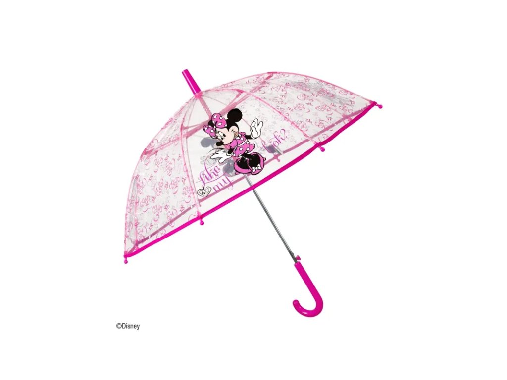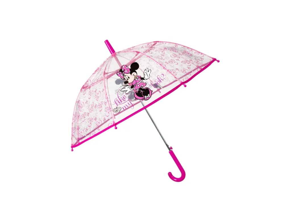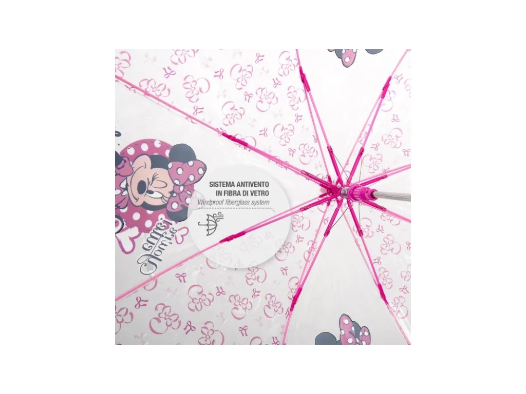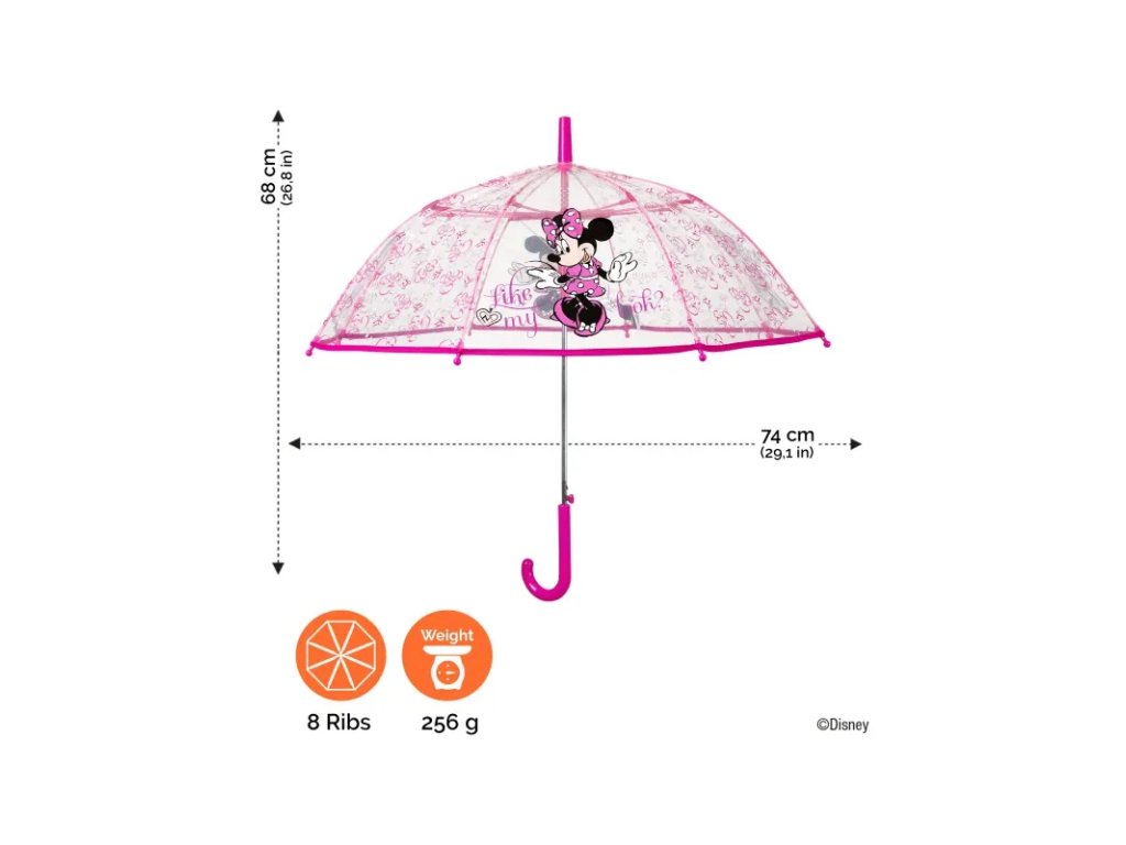 Veselý deštník s automatickým otevíráním a pohádkovým potiskem MINNIE MOUSE. Deštník má kvalitní a pružnou konstrukci. Průměr nataženého deštníku je 74cm.• automatické otevírání (vystřelovací mechanismus)