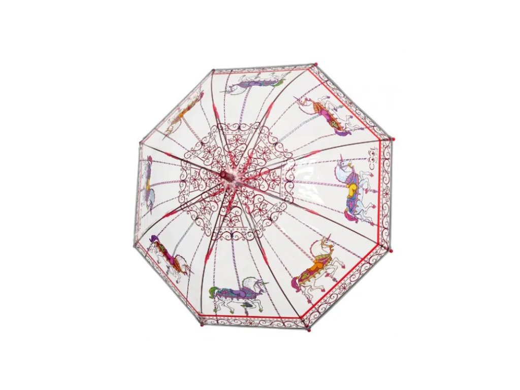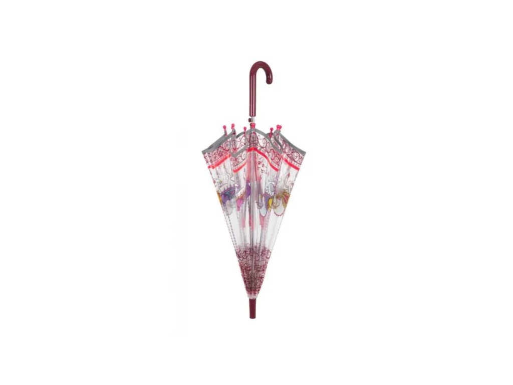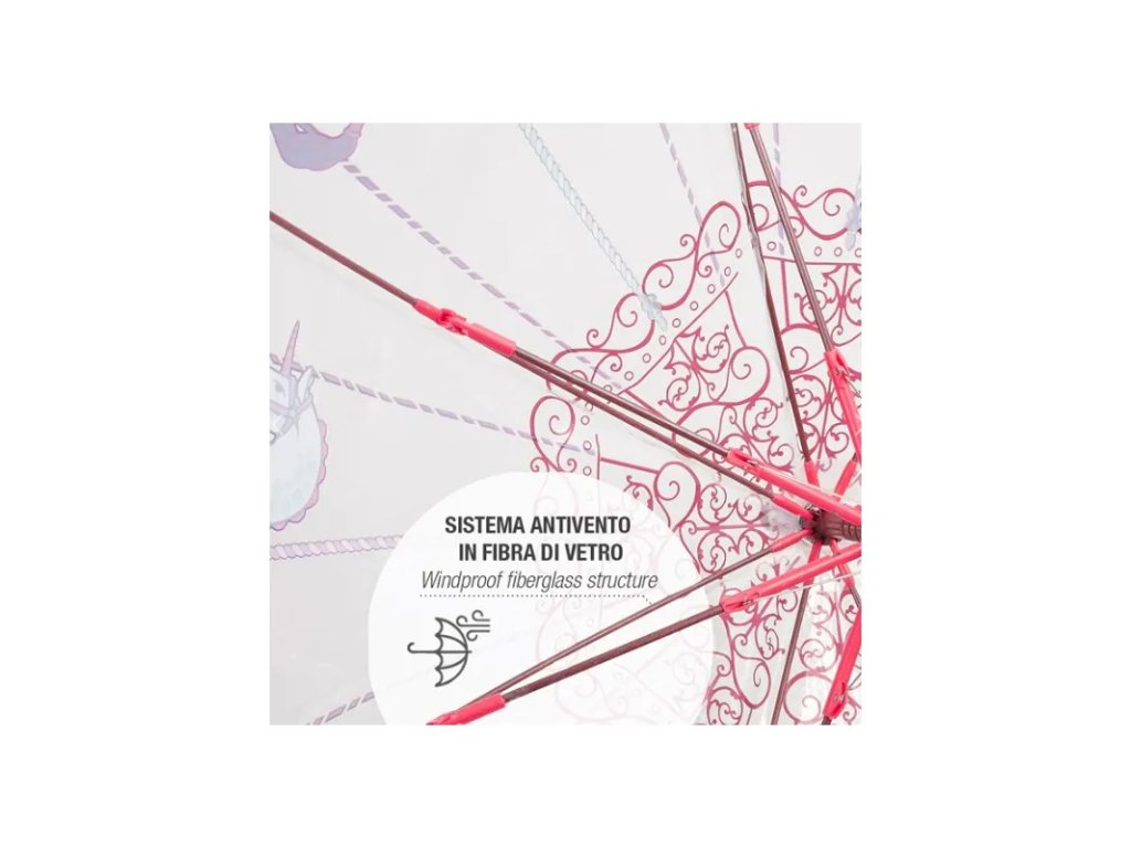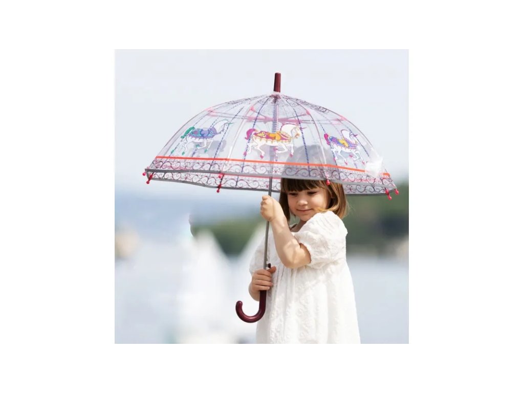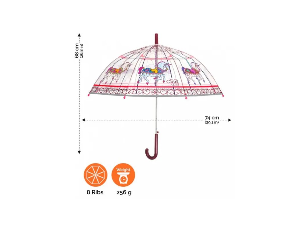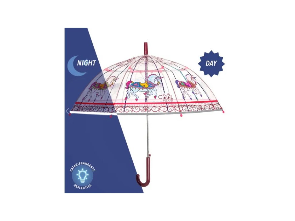Zábavný, barevný a originální doplněk pro všechny malé holčičky, které se rády odlišují. Průhledný kupolovitý deštník s kolotočem je doplněk, který spojuje estetiku a praktičnost díky pohodlnému systému automatického otevírání, který umožňuje rychlé otevření. Reflexní profily zajišťují maximální viditelnost, protože odrážejí světlo a svítí při průchodu světlometů auta. Sklolaminátové tyče rámu deštníku zajišťují vynikající odolnost proti větru. POE tkanina je zcela bez toxických látek, což je dobré pro zdraví dětí, ale také pro životní prostředí. Vhodné pro dívky ve věku od 4 do 6 let.• manuální otevírání, reflexní pás po obvodu celého deštníku
