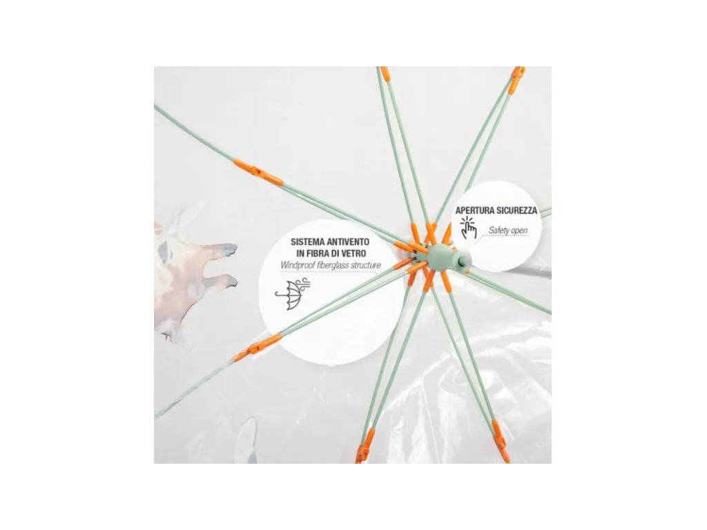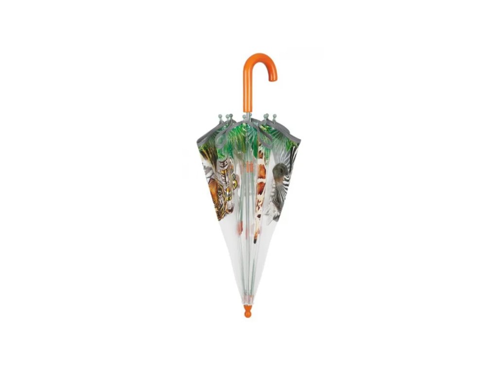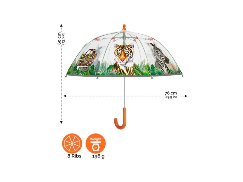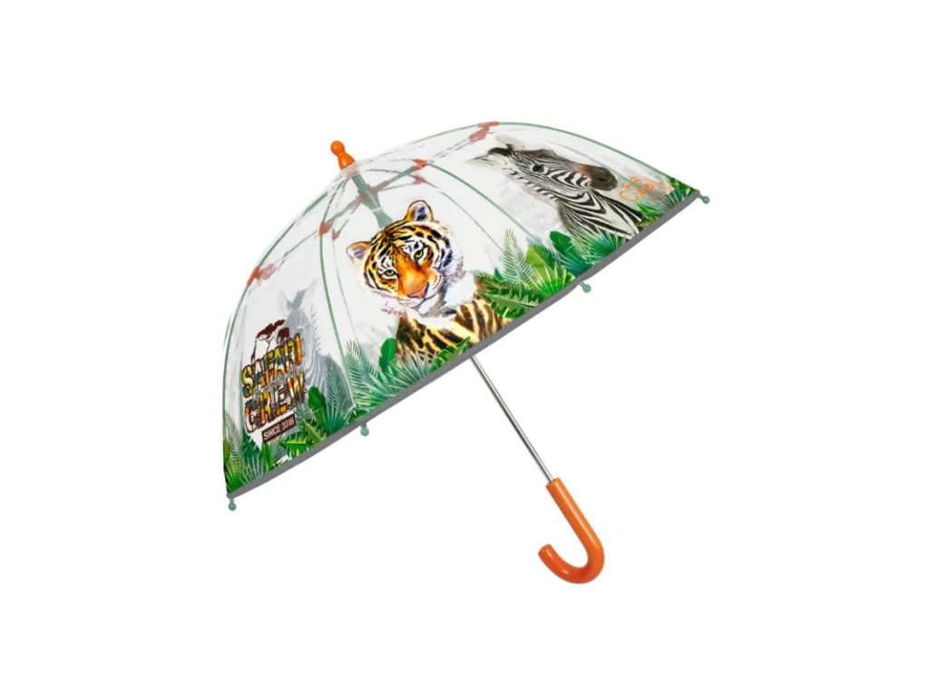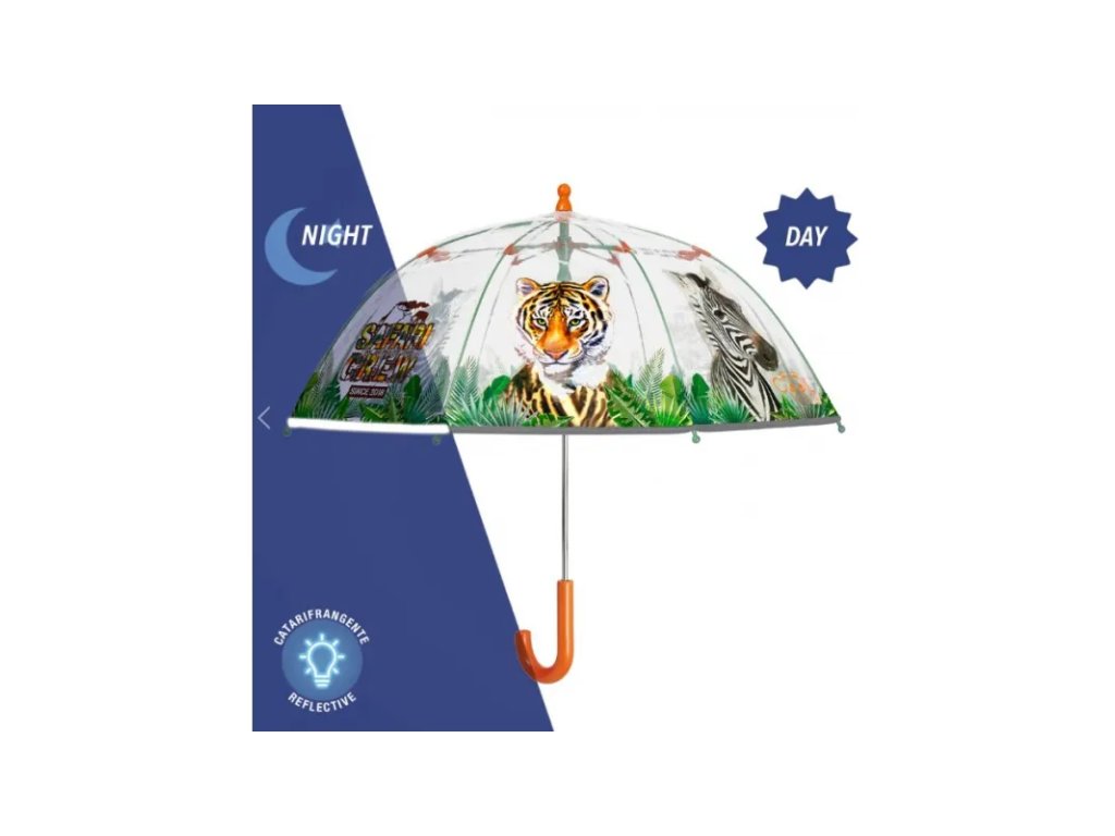 Tento roztomilý průhledný deštník s potiskem tygra a zebry je jedinečným doplňkem, který vaše děti přenese na safari. Jeho reflexní lemování zajišťuje maximální viditelnost, neboť odráží světlo a svítí při průjezdu světlomety auta. Deštníky z řady COOL KIDS mají tyče ze skelných vláken, díky kterým je doplněk odolný vůči nárazům větru. Otevírání deštníku je manuální a usnadňuje jej systém šetřící prsty, takže je ideální pro děti ve věku od 3 do 5 let.• manuální otevírání, reflexní pás po obvodu celého deštníku