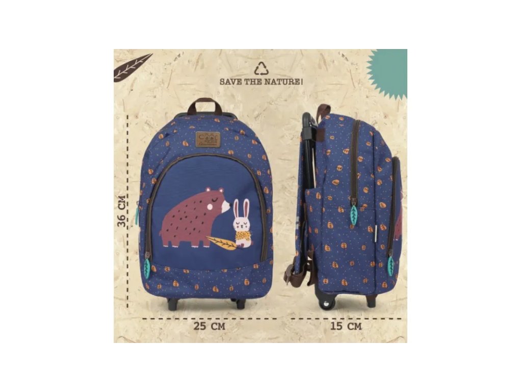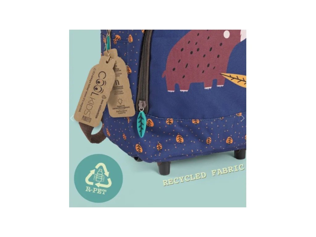 Tento batoh s odnímatelným vozíkem je součástí řady Cool Kids Eco Collection, která obsahuje doplňky vyrobené z R-PET látek z recyklace plastových lahví. Ekologická volba, užitečný dárek, který si vezmete s sebou ve volném čase i do školky, který obsahuje hračky a doplňky. Tento batoh s odnímatelným vozíkem je součástí kolekce Cool Kids Eco, která zahrnuje doplňky vyrobené z tkanin R-PET z recyklovaných plastových lahví. Ekologická volba, užitečný dárek pro volný čas a do školky na hračky a doplňky. Reflexní detaily na ramenních popruzích zajišťují viditelnost i během tmavých dnů. Barevný potisk medvěda a zajíčka s malými žlutými lístky nás vrací do světa přírody, abychom se ji od útlého věku učili milovat a starat se o naši planetu. Praktičnost, prostor a recyklované materiály pro zelený svět!• rozměry: 40 x 25 x 15cm