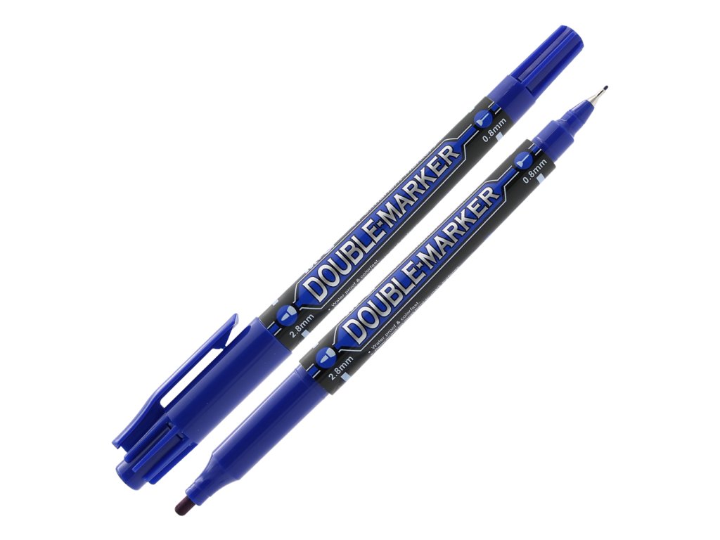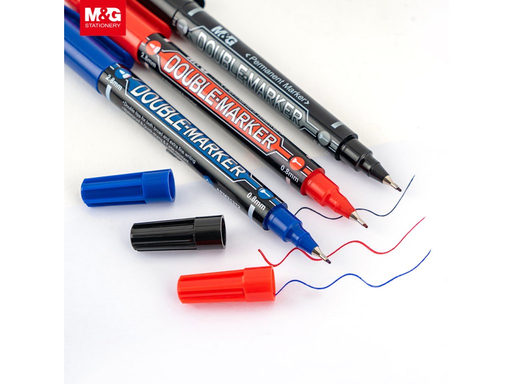 Oboustranný permanentní popisovač Double-Marker M&G. Permanentní inkoust na bázi lihu, odolný vůči vodě a vyblednutí, rychleschnoucí. Píše na papír, gumu, kůži, plasty, kovy. Tenký hrot - šířka stopy 0,8 mm, tlustý hrot - šířka stopy 2,8 mm.Doplňkové parametry