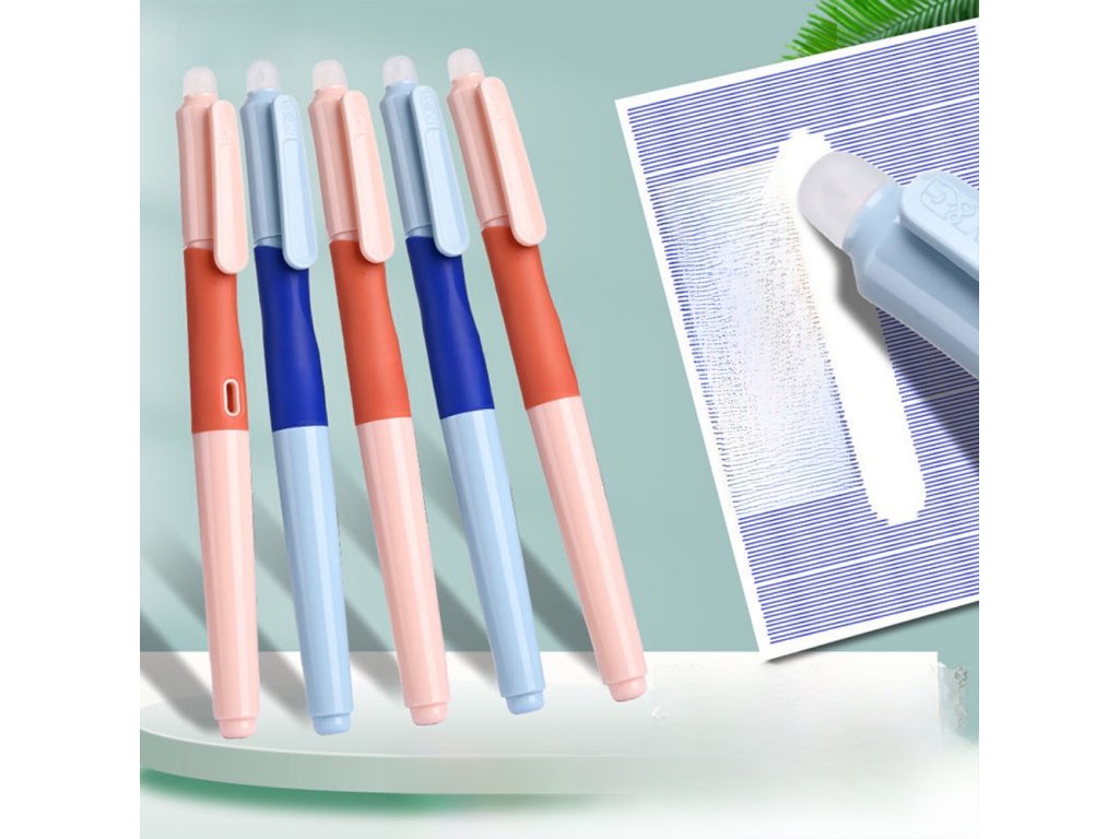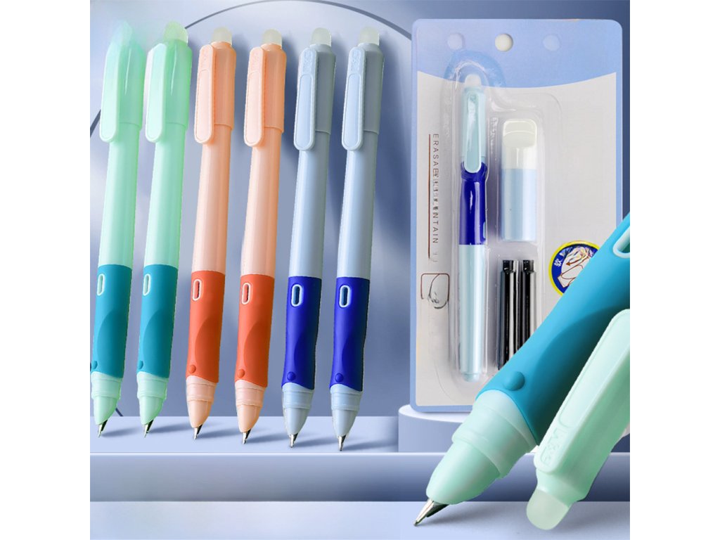 Gumovací bombičkové pero pro děti, které se učí psát, v zelené, modré nebo oranžové barvě.