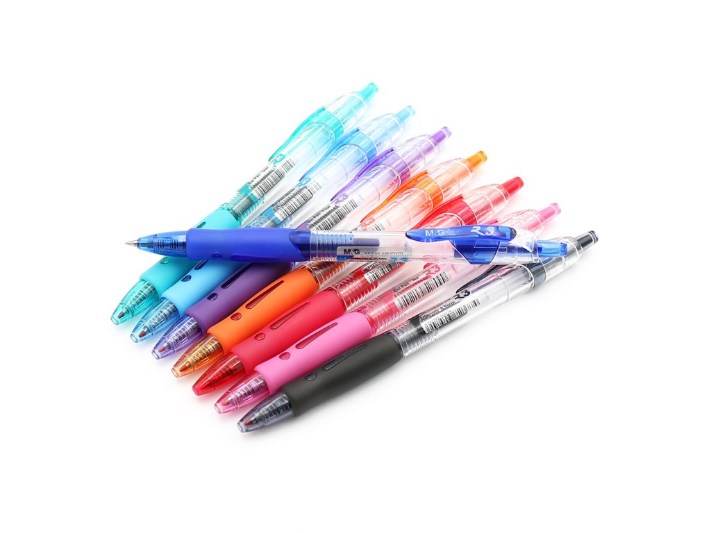 Gelové pero s transparentním plastovým tělem a velkoobjemovou náplní.