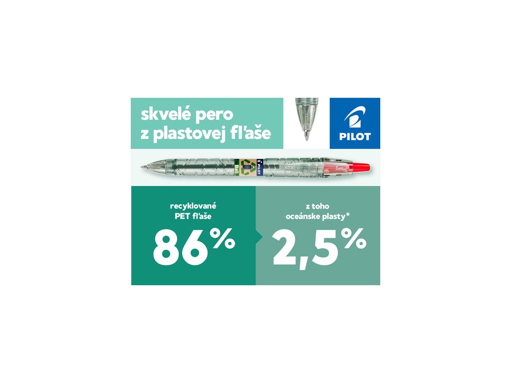 Kuličkové pero se stiskacím mechanismem a vyměnitelnou náplní. Vyrobeno z 86% z recyklovaných plastových lahví s podílem 2,5% recyklovaného oceánského plastu - tvar těla upozorňuje na druh použitého materiálu - - inkoust na olejové bázi pro hladší psaní - kulička z karbidu wolframu v hrotu pera zajišťuje přesnou linii a dlouhou životnost hrotu - koupí produktu B2P a použitím min. 3 náhradních náplní snížíte uhlíkovou stopu výrobku až o 85% ve srovnání s nákupem 3 nových produktůDoplňkové parametry