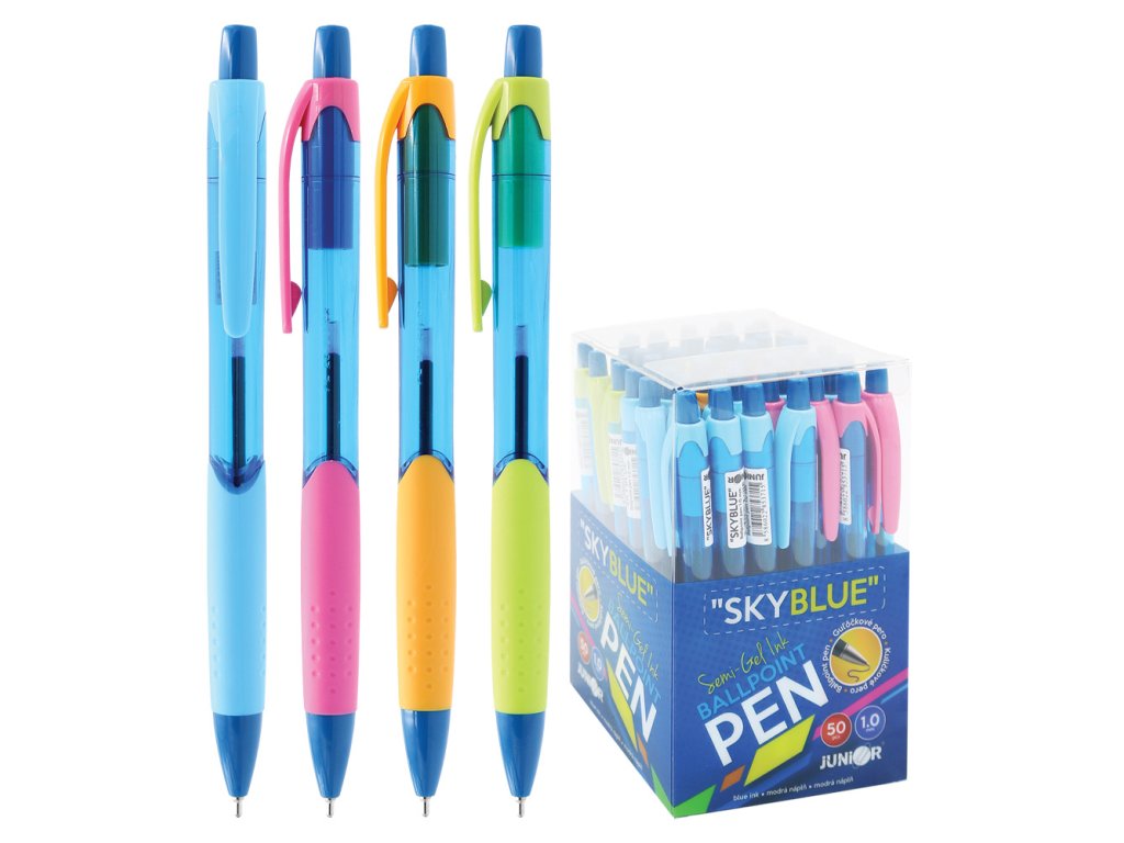 Kuličkové pero s průhledným, modrým tělem SKYBLUE a barevnými doplňky (4 barvy v balení).