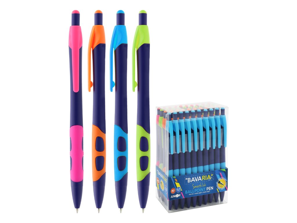 Kuličkové pero Bavaria s plastovým tělem ve čtyřech barvách: růžové, oranžové, modré, zelené v kombinaci s tmavě-modrou.