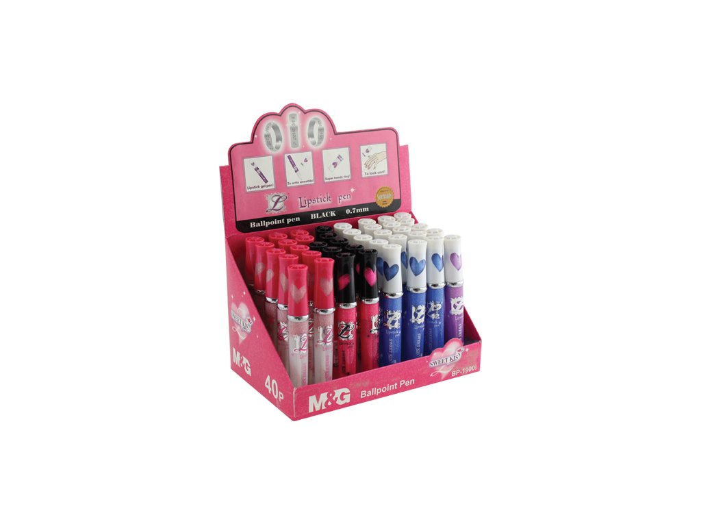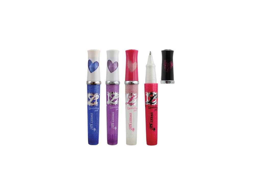 Mini kuličkové pero ve tvaru lesku na rty, s glitrovým plastovým tělem a dekorativním vrškem, s modrou náplní, průměr kuličky 0,7 mm, dodávané v 4 barevných provedníchDoplňkové parametry