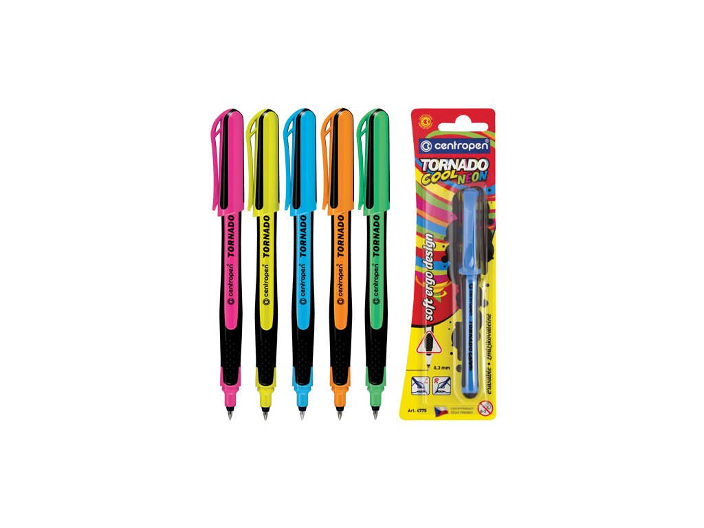 Oblíbené kuličkové pero Tornado s trojúhelníkovou úchopovou částí s masážními body; s tenkou rovnoměrnou stopou šírky 0,3 mm, která se dá vyzmizíkovat; inkoustová náplň modré barvy vonící ovocem. Tělo pera z kvalitního plastu, dodávané v různých barevnýchDoplňkové parametry