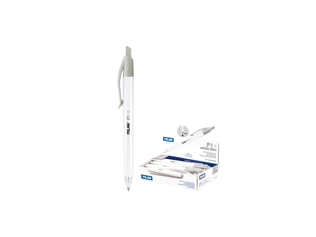 Pero s černým inkoustem P1, antibakteriální vydání. Ošetřené fosforečnanem stříbrným (CAS 308069-39-8) s antibakteriálním účinkem. Ideální na zlepšení hygieny ve škole, v kanceláři, v prostředích v kontaktu s potravinami a sanitárním prostředím. Bílá hlaveň s tlačítkem a sponou. Přibližná délka zápisu 1 200 metrů. 1 mm hrot. Inkoust vyrobený v Německu. Rozměry pera: 141 x 17 cm.Doplňkové parametry
