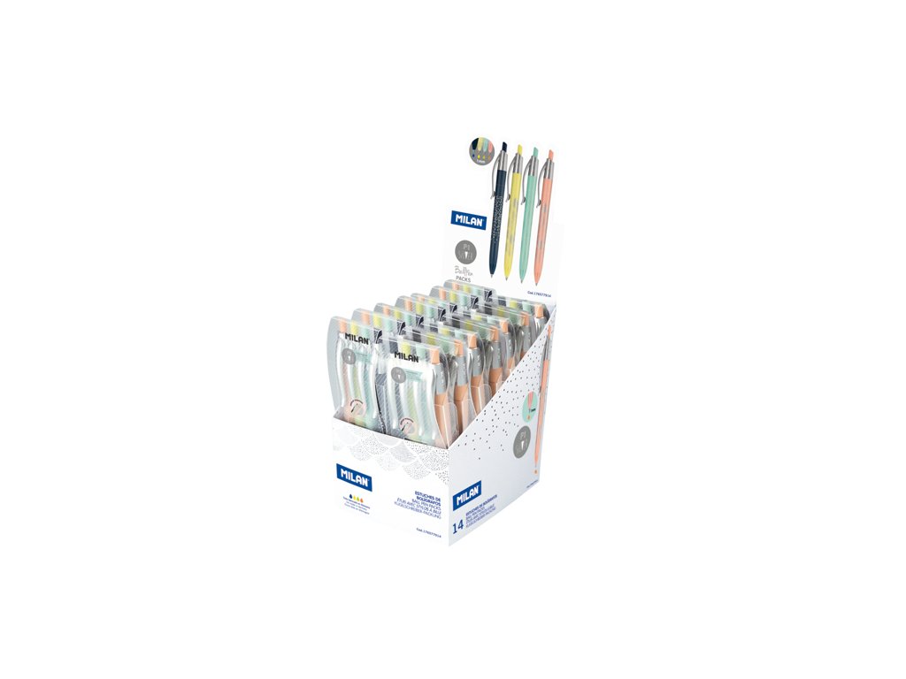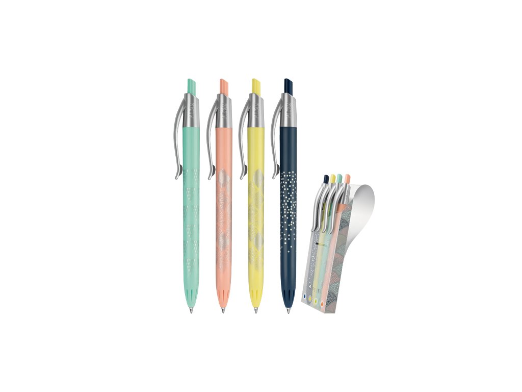 Pružné pouzdro obsahuje 4ks P1 stříbrné pera s tělem stejné barvy: modrá, žlutá, růžová a zelená. Hrot 1 mm. Kuličkové pero se stříbrnou barvou těla a barevnými doplňky. Příjemné na dotek, sametový pocit úchopu, plynulé a jemné psaní s modrou náplní. Průměr hrotu 1 mm.Doplňkové parametry