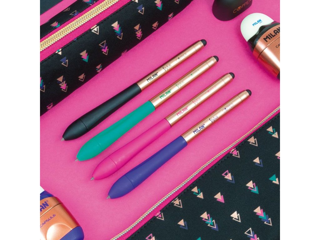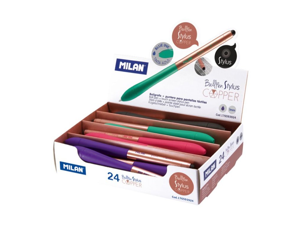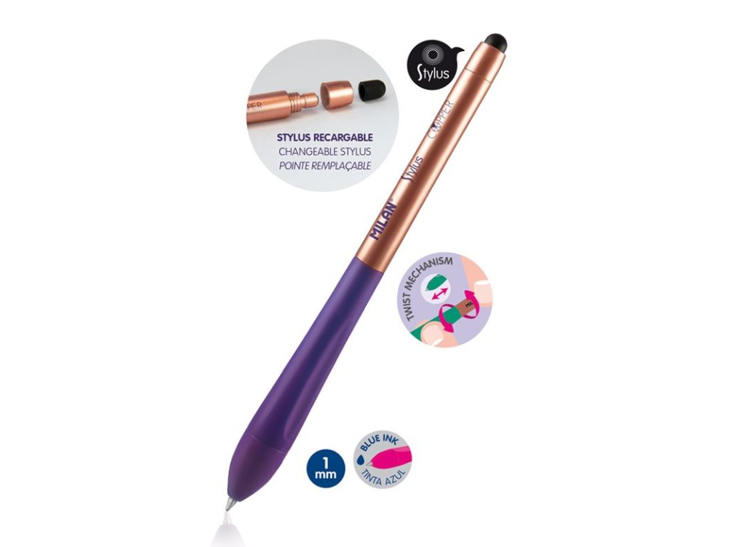 Kuličkové pero MILAN Stylus s ukazatelem pro dotykové obrazovky, má modrý inkoust. Design Copper Edition. K dispozici ve 4 barvách, které jsou kombinovány s měděným povrchem: fialová, černá, růžová, zelená. Přibližná délka zápisu: 700 metrů. 1 mm hrot. OrDoplňkové parametry