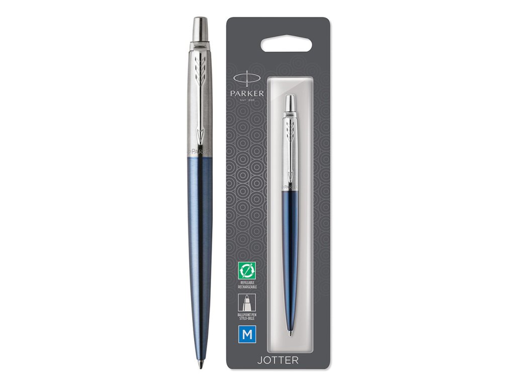 Pero kuličkové PARKER Jotter Waterloo Blue CT. Parker Jotter je designérskou klasikou a důvěrně známým modelovou řadou, oceňovaným predovšetkýn pro svou kvalitu, spolehlivost a příznivý poměr ceny a výkonu. Lakované tělo z broušené nerez oceli a vrchní část z broušené nerez oceli. V kombinaci s doplňky z nerez oceli pokovenými chromem, s leštěnou úpravou.Doplňkové parametry