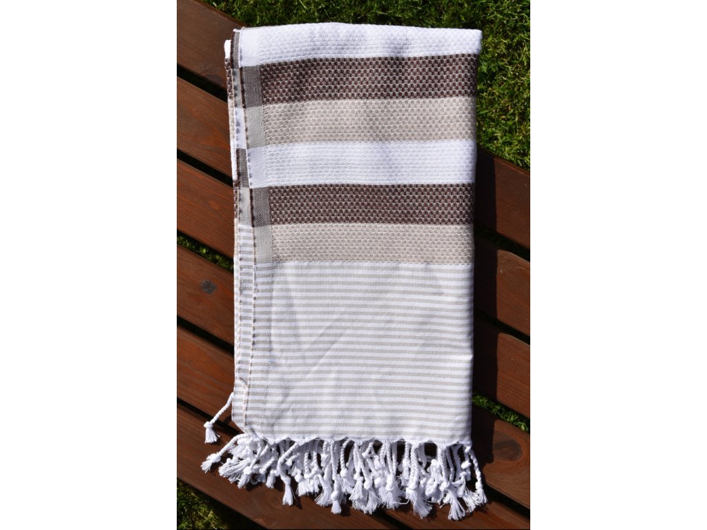 Osuška je s pruhovaným vzorem Hnědé, béžové a bílé barvy a na jejím konci jsou ručně vázané třásně