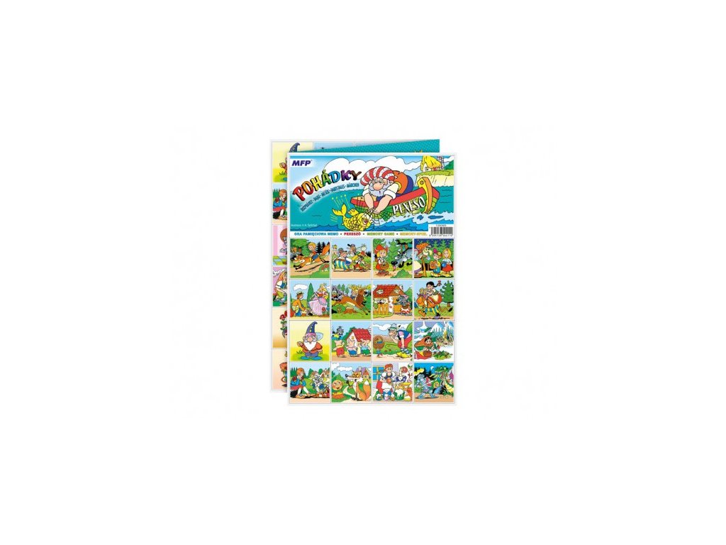 PEXESO je populární dětská stolní hra, která nikdy neomrzí a zapojit se můžou i dospělí. Pexeso - Pohádky - nás zavede zpět k pohádkovým hrdinům z českých pohádek Hrnečku vař!, O šípkové Růžence, Kocour v botách, Čert a Káča a mnoho dalších. Věděli jste, že slovo PEXESO vzniklo souslovím slov PEKELNĚ SE SOUSTŘEĎ? Výborná učební pomůcka pro děti a rodiče. Naučte své děti poznávat zvířata a procvičujte jejich paměť. Tato hra je zabaví na dlouhé hodiny. NÁVOD KE HŘE PEXESO:Pexeso mohou hrát nejméně dva hráči. Všechny rozstříhané kartičky zamíchají a rozloží obrázkem dolů do čtverce 8 x 8 kartiček. Nesmí se při tom dívat na obrázek. Hráči si určí pořadí hry. Hráč otočí dvě libovolné kartičky tak, aby si i ostatní spoluhráči mohli obrázky a jejich umístění zapamatovat. Pokud nemají kartičky stejné obrázky, otočí je a vrátí na původní místo. Pokračuje další hráč, který je na řadě. Jestliže objeví stejné obrázky, získává bod a obě kartičky vyřadí ze hry. Pokračuje do té chvíle, kdy otočí dva různé obrázky. Vyhrává hráč, který získá více bodů. PAPÍR: křída matná 350g + lamino lesk 1/1VELIKOST HRACÍCH KARET: 51x51cmDoplňkové parametry