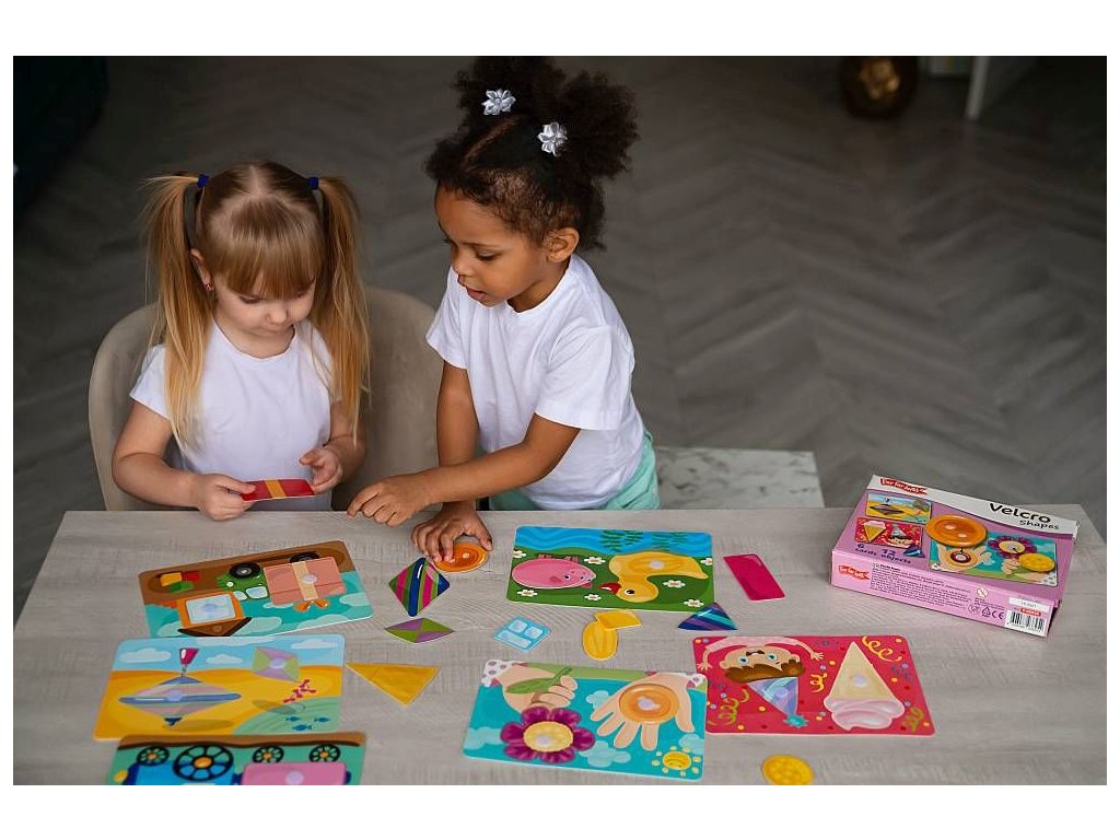 Naučná skládačka pro děti od 12 měsíců. 6 pružných plastových destiček se suchým zipem a 12 velkých samostatných dílků, které umístíte na destičky pomocí suchého zipu. Poznáte jaký je tvar draka, zmrzliny nebo slunce? Naučná skládačka pro děti od 12 měsíců. Děti hledají dílky, které mají stejný tvar jako je předlohy na destičce. Poznáte jaký je tvar draka, zmrzliny nebo slunce? CO JE UVNITŘ? Sada obsahuje 6 pružných plastových destiček se suchým zipem a 12 vetších samostatných dílků, které umístíte na destičky pomocí suchého zipu. Díky této vychytávce jednotlivé díly jen tak nespadnou a budou držet na správném místě. Všechny části jsou vyrobené z odolného, ale tenkého plastu se speciální povrchovou úpravou, která je dětem příjemná na dotek. JAK HRÁT? Berte jednotlivé dílky jeden po druhém a povídejte dětem co na nich je. Potom vezměte destičku s obrysy předmětů a vybídněte dítě, aby našlo správný předmět pro každý obrys a připevnilo ho pomocí suchého zipu na správné místo. Zjistěte více o různorodých tvarech, naučte se je rozlišovat , poznávejte barvy, procvičte slovní zásobu společně s jemnou motorikou a koordinaci ruka-oko. BENEFITY: - zlepšuje motorické schopnosti - trénuje vyjadřování a mluvenou řeč - cvičí paměť a postřeh - upevňuje udržení pozornosti Zjistěte více o různorodých tvarech a naučte se je rozlišovat. Poznávejte barvy, procvičte slovní zásobu společně s jemnou motorikou a koordinaci ruka-oko.Doplňkové parametry