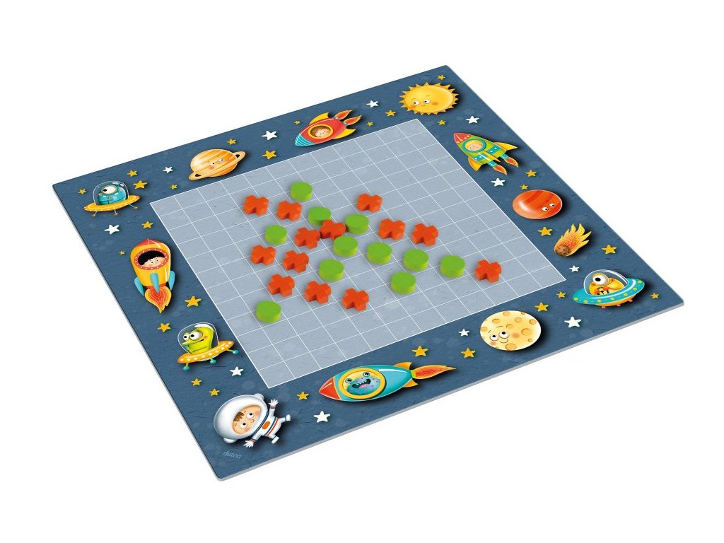 Oblíbená strategická hra pro dva hráče s oboustranným hracím plánem s motivy vesmíru a vodního světa. Hra obsahuje plán z tvrdého kartonu o rozměrech 316x316 mm a dřevěné herní kameny (kolečka O 15 mm a křížky 16x16 mm). Baleno v papírové krabici o rozměrech 335x230x35 mm. Varování: nevhodné pro děti do 3 let. Obsahuje malé části. Nebezpečí zalknutí.Doplňkové parametry