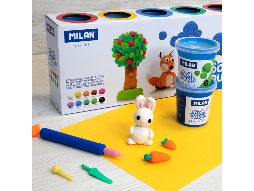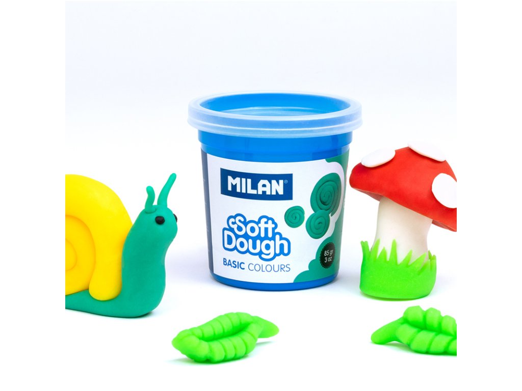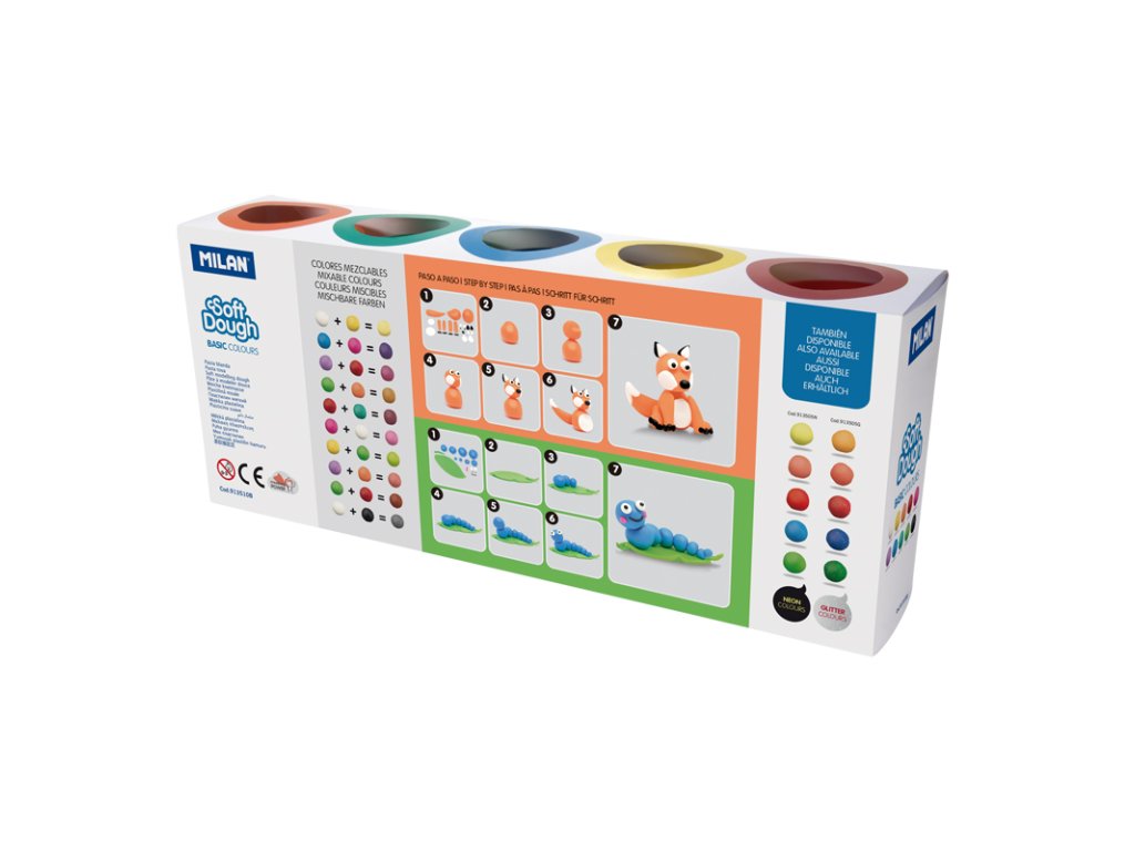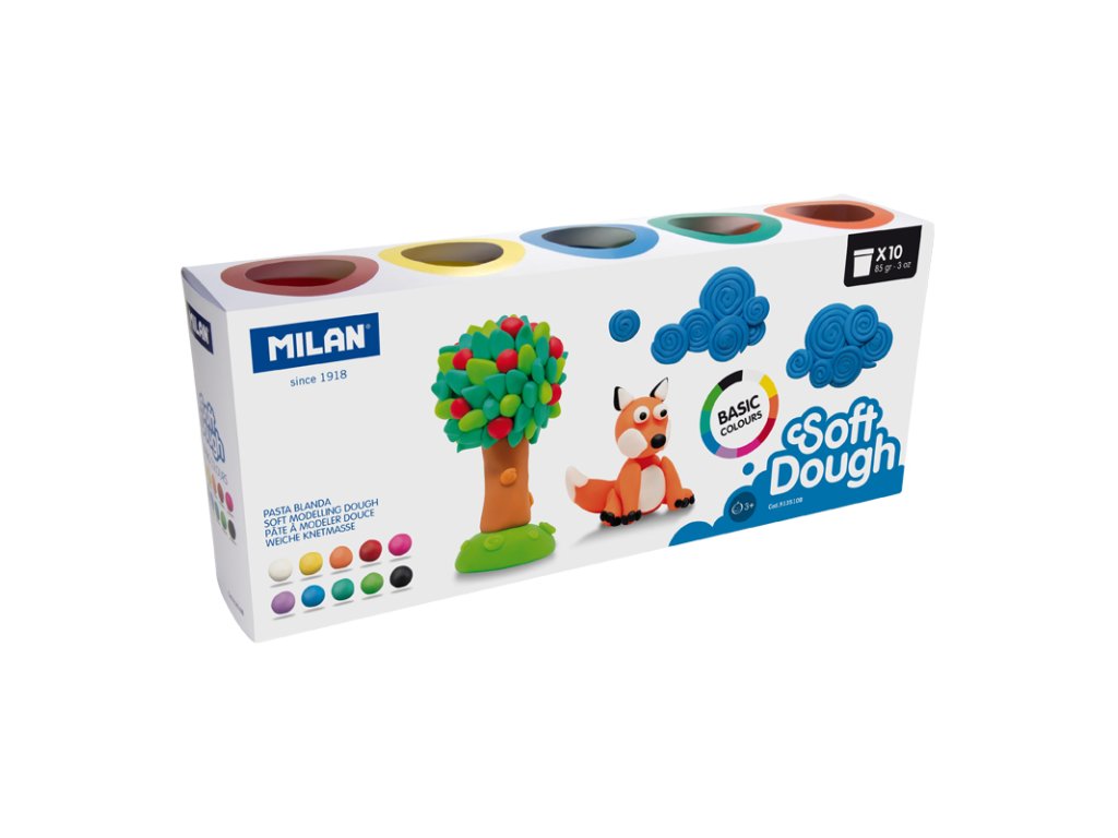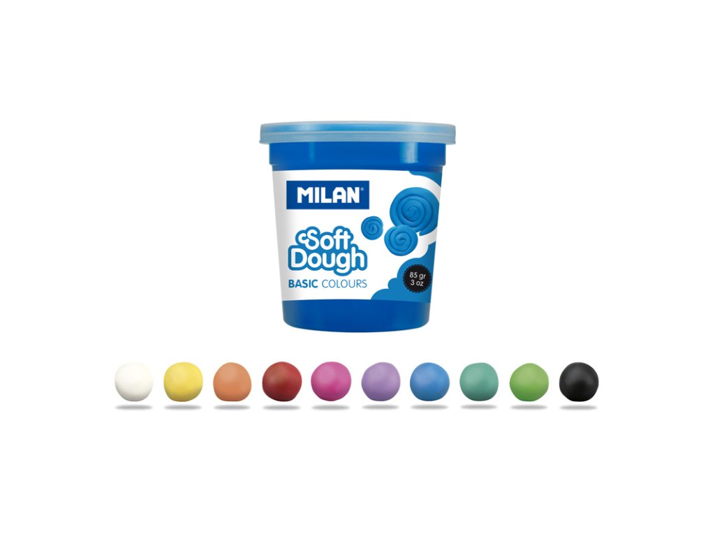 Plastelína / modelovací hmota MILAN Soft Dough v základních barvách. Sada obsahuje mix 10 barev: bílá, žlutá, oranžová, červená, růžová, fialová, modrá, tmavě zelená, světle zelená a černá. Jednotný a elastický, lehce formovatelný materiál na modelování. Nové barvy lze vytvořit kombinací dvou nebo více barev. Na rukou nezanechává žádné zbytky. Dodávané v krabičkách 142 g s průhledným víčkem. Perfektní pro hraní s kamarády a na párty. Pro děti od 3 let.Doplňkové parametry