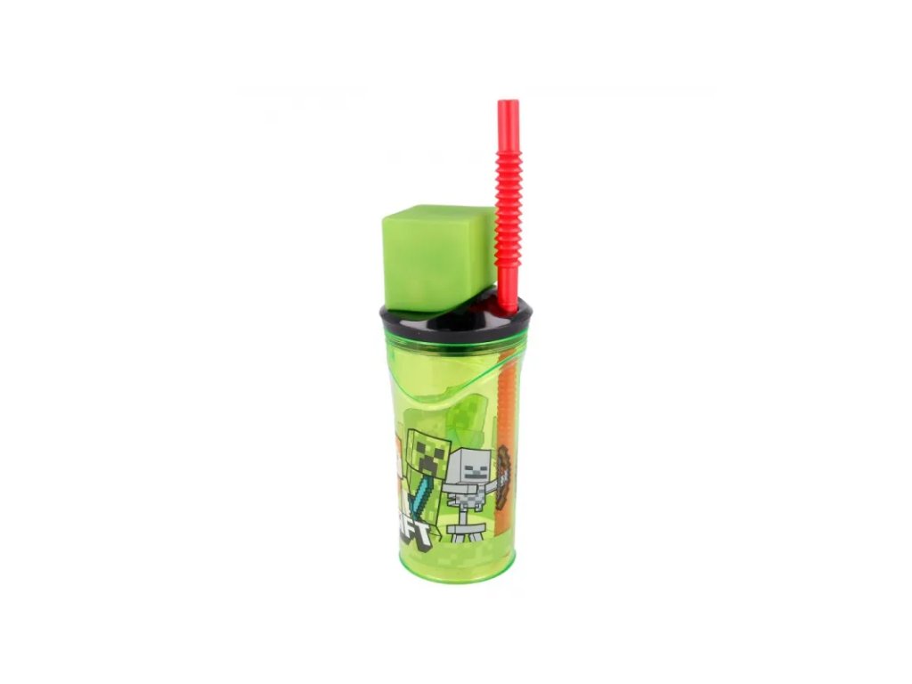 Veselá sklenice na pití s motivem MINECRAFT. Praktické šroubovací víko a nastavitelná brčka zajistí pití bez zbytečného rozlévání. • šroubovací víko • plastový, vhodný pro děti od 3 let • objem: 360 ml, výška 23cm, BPA free