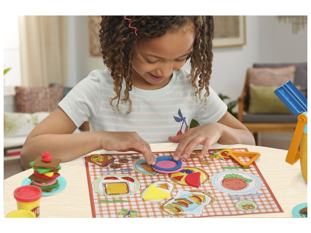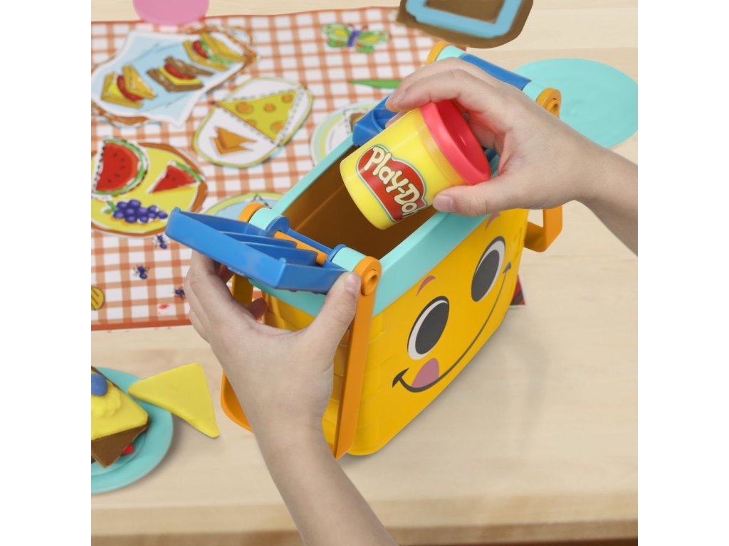 Ať prší nebo svítí slunce, Play-Doh Piknik sada pro nejmenší je dokonalý dětský piknikový set pro každou příležitost! Dodává se s 12 startovacími nástroji, 6 barvami hmoty Play-Doh a piknikovým košem na hračky pro uložení nástrojů. Když děti prozkoumávají základní tvary, jako jsou čtverce, kruhy a trojúhelníky, mohou využít svou představivost a skládat tyto tvary do sendvičů Play-Doh. Představte si dětské hry na piknik s legračním občerstvením a broučky na straně hrací podložky se vzhledem piknikové deky, nebo podložku otočte a pusťte se s dětmi do zábavného řazení tvarů do různých pořadí. Ať už je to první sada Play-Doh nebo dárek pro děti od 3 let, umožněte jim objevit radost z hraček Play-Doh!Doplňkové parametry
