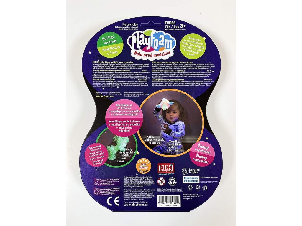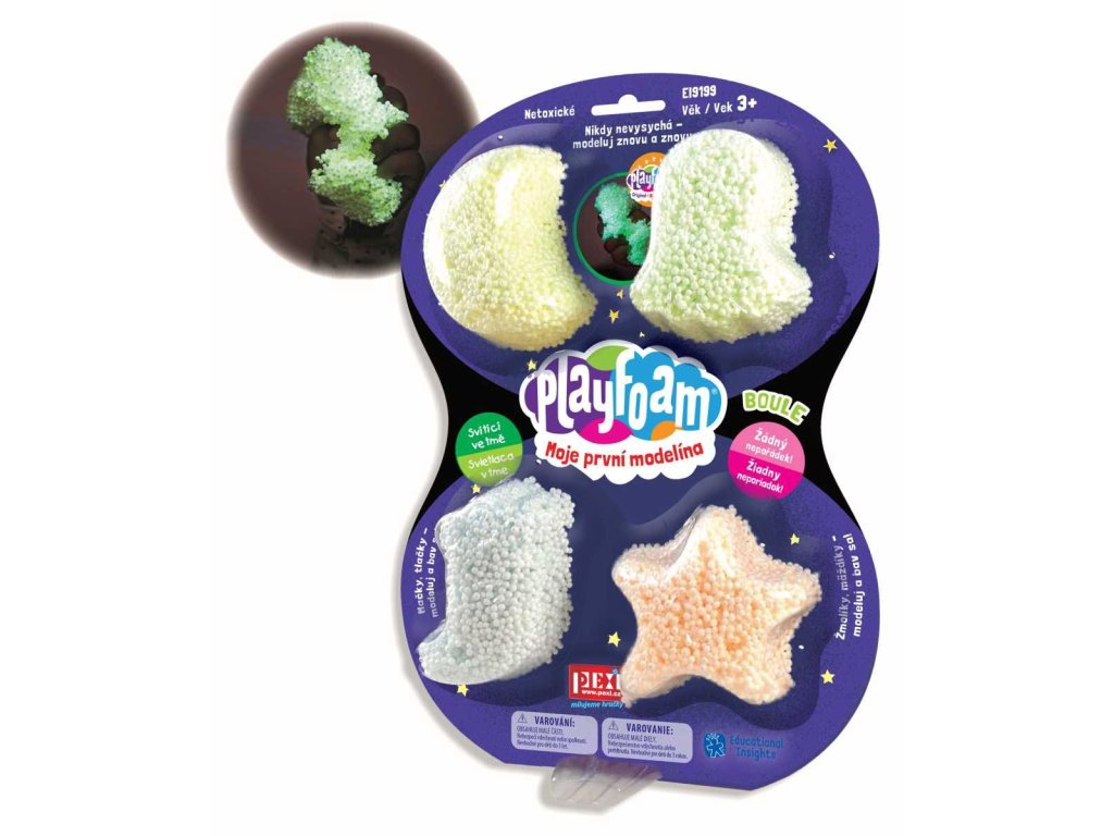 Rozzářete svoje výtvory! Modelína, která nešpiní, vhodná od 3 let do 10 let. Zhasněte vypínač a sledujte, jak vaše mistrovská díla září ve tmě! Balení se čtyřmi barvami fosforeskující modelíny zářící ve tmě, která se nepřilepí k podkladu ani se nezašlape do koberce. Lehoučká, nešpinivá, netoxická modelína nevysychá a zůstává stále tvárná. Díky tomu s ním můžete modelovat stále dokola. Najvyšší kvalita použitého pojiva zaručuje, že modelína drží stále pohromadě i po mnoha hodinách hraní. Nerozpadá se, je netoxická, nešpiní a nemastí. Děti vytvoří vše co je napadne a uklizeno máte za okamžik. Žádný nepořádek, spousty legrace - a tmy už se nebudete bát! A protože se modelína PlayFoam® nelepí na stůl, koberec ani sedačky, můžeš si jí s sebou vzít kam chceš a užít si zářící dobrodružství i na cestách! Balení obsahuje barvy: jemně žlutá, jemně zelená, jemně modrá, jemně růžováDoplňkové parametry