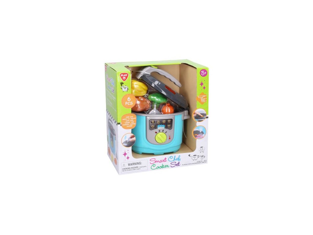 Hrnec s párou a efekty. Velikost 16cm. Obsahuje hrnec s poklicí a potravinami. Tlačítko aktivuje světlo, bublavý zvuk a studenou páru. Pro vytvoření páry je nutné nalít vodu do poklice k tomu určeným otvorem. Návod na krabici. Baterie součástí.Doplňkové parametry