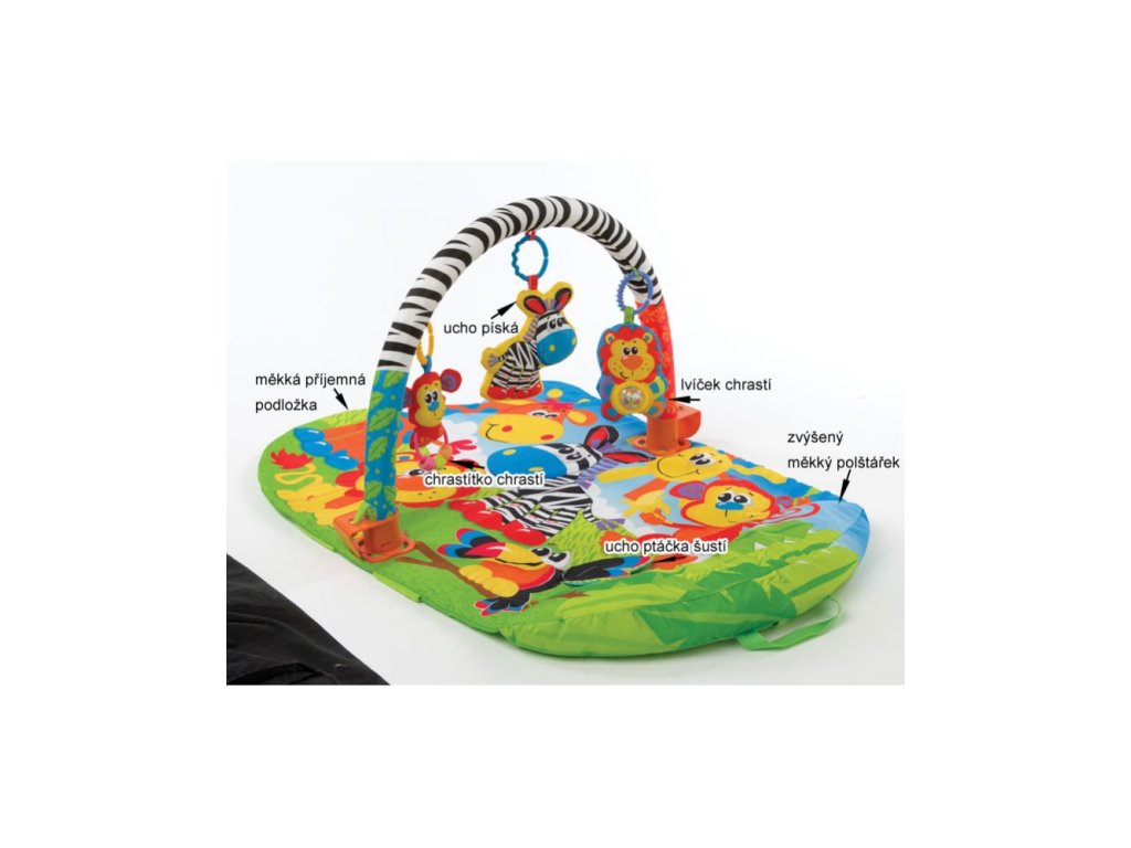 Mnohostranné využití: Na zemi i v postýlce: Hrací podložka Safari není pouze obyčejná podložka na zem. Textilní oblouk se závěsnými hračkami lze připevnit k podložce, zavěsit nad postýlku nebo upevnit textilními poutky se suchým zipem po straně postýlky. Vaše dítě si může hrát kdekoli, ať už je to v obývacím pokoji nebo bezpečně ve své postýlce. Stimulační prostředí: Pestrobarevné motivy a vzory: Měkká podložka je pokryta motivy zvířátek, které děti milují – od veselých opiček po dobrodružné lvy. Barevné obrázky stimulují dětský zrak a podporují rozpoznávání tvarů a barev. Chrastítka, pískátka a kousátka: Závěsné hračky nejsou jen na okrasu! Chrastí, pískají a slouží jako kousátka, čímž stimulují smysly Vašeho dítěte a podporují motorický rozvoj. Podpora fyzického rozvoje: Lezení a hraní na bříšku: Měkce vyplněná podložka a šustivé aplikace podporují děti v hraní na bříšku a v lezení. To je klíčové pro posilování zádových svalů a správný vývoj motorických dovedností. Bezpečnost a kvalita: Navrženo v Austrálii: Hrací podložka Safari je navržena tak, aby splňovala nejpřísnější bezpečnostní normy. Vysoce kvalitní materiály zajišťují, že je produkt bezpečný pro Vaše dítě od prvního dne. Vhodné od 0 měsíců: S hrací podložkou Safari můžete začít už od prvních dnů života Vašeho miminka. Bezpečná a měkká podložka poskytuje pohodlný a bezpečný prostor pro hraní. Praktické rozměry: 100 x 60 x 40 cm: Dostatečně velká na to, aby nabídla dostatek místa pro hraní, ale zároveň dostatečně kompaktní, aby se vešla do jakékoli místnosti či postýlky.Doplňkové parametry