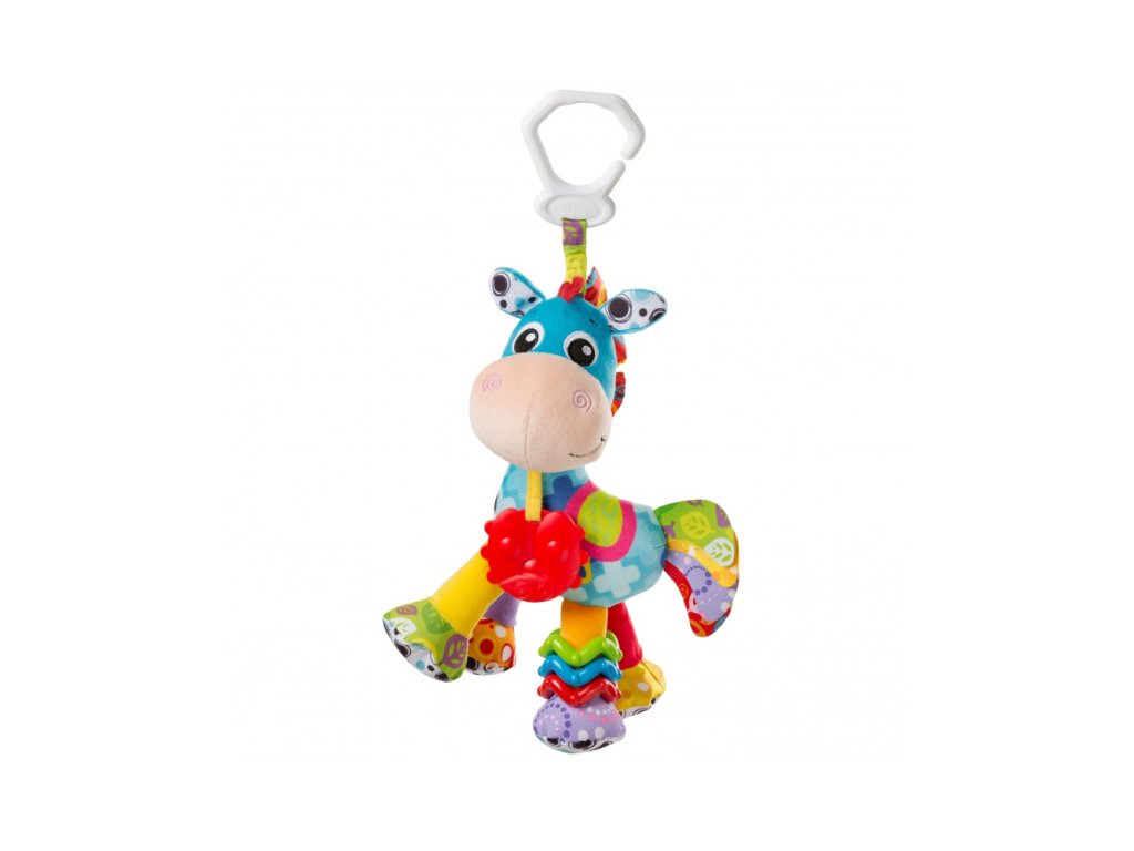Playgro Koník Klusáček: Měkký textilní koník je to nejlepší, co svému miminku můžete dopřát. Je vyroben z pestře vzorovaných materiálů, které působí příznivě v rozvoji dětského zraku. Rozmanité struktury materiálů stimulují dětský hmat. Koníkovi tlapičky šustí a v jedné nožce je ukryta řachtací kulička. Na krku má pověšené kousátko, které uleví od bolesti při prořezávání zoubků. Hračka je opatřena závěsným klipem, kterým je možné hračku zavěsit na postýlku, kočárek nebo autosedačku. Vhodné od 0+. Čištění: Hračku pouze ručně omývat navlhčeným hadříkem.Doplňkové parametry