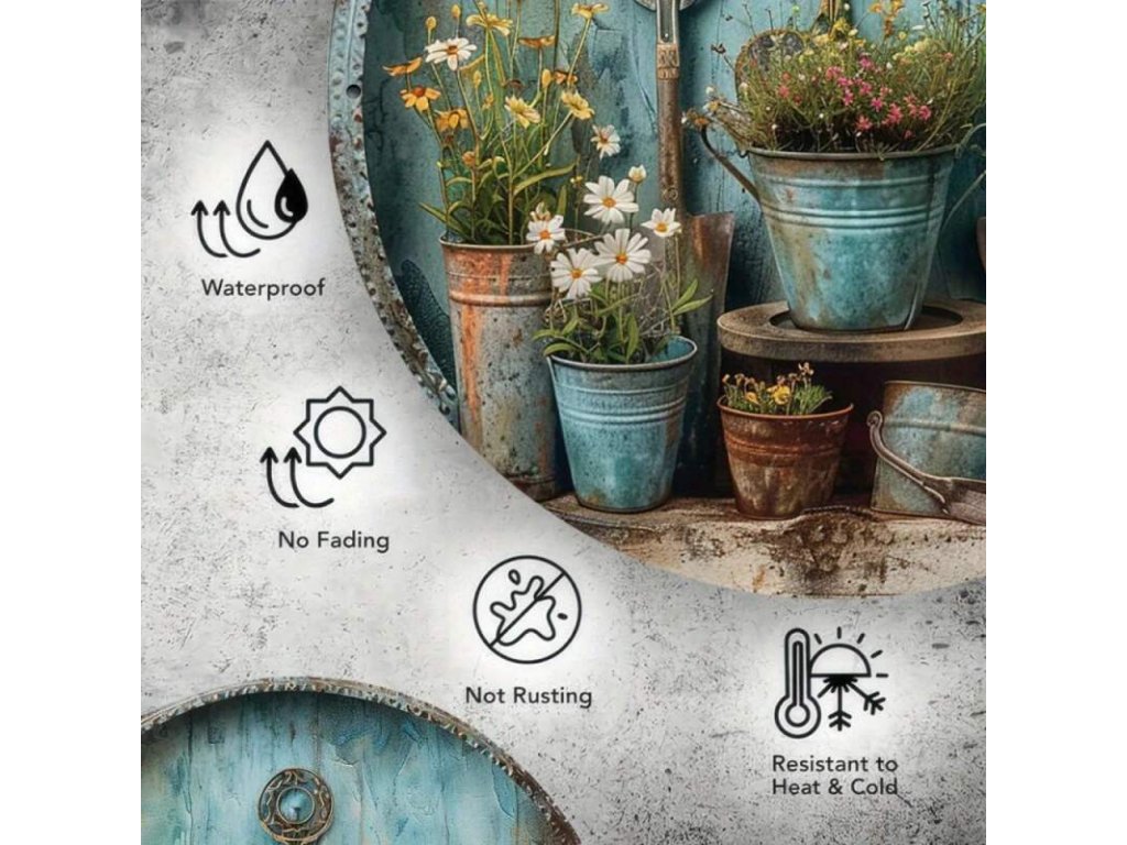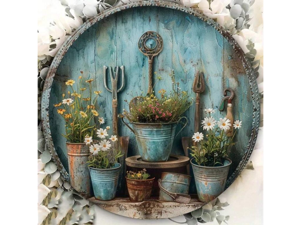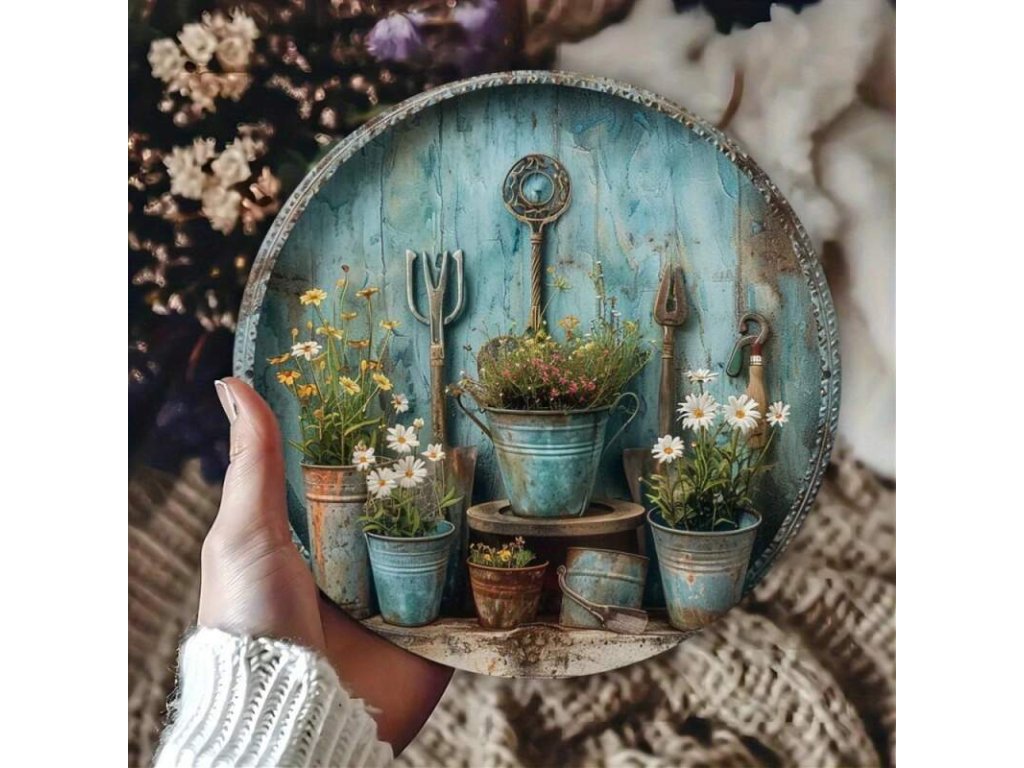 Plechová vintage cedule se zahradním nářadím a květinovým vzorem 20cm