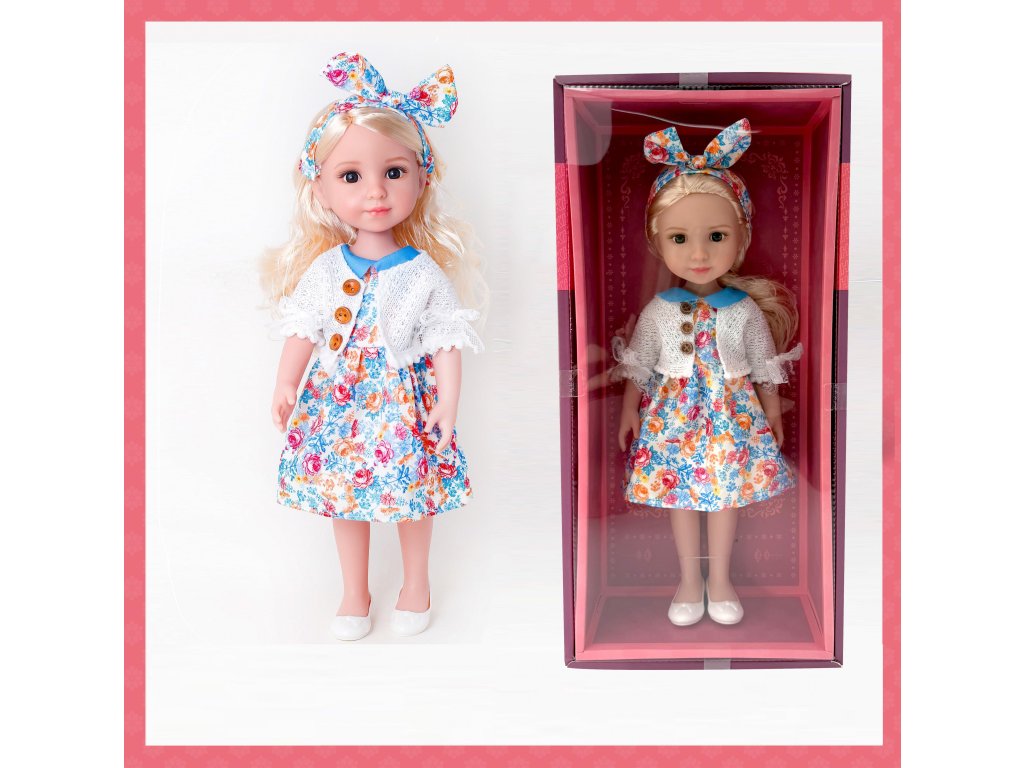 Představ si roztomilou panenku, vysokou přibližně 38 centimetrů, která je ideální velikostí pro dětské ruce a hraní. Na první pohled zaujmou její blonďaté vlásky, Na první pohled zaujmou její blonďaté vlásky, oblečená je do šatiček s květinovým vzorem. Tyto šaty jistě hrají barvami a evokují jaro nebo léto díky motivům květů. K šatičkám má panenka i svetřík. Svetřík panenku zahřeje, když je chladněji, a dodává jí na roztomilosti. Její nožky zdobí bílé botičky. Bílá barva botiček je univerzální a hezky ladí s květinovými šaty a svetříkem. Celkově tato panenka působí mile a přívětivě. Její blonďaté vlásky, květinové šaty, svetřík a bílé botičky tvoří harmonický a roztomilý vzhled, který jistě potěší každé dítě. Je to ideální společnice pro nejrůznější hry a dobrodružství, ať už doma, nebo na cestách. Děti si s ní mohou hrát na maminku, kamarádku, nebo prožívat nejrůznější příběhy plné fantazie.Doplňkové parametry