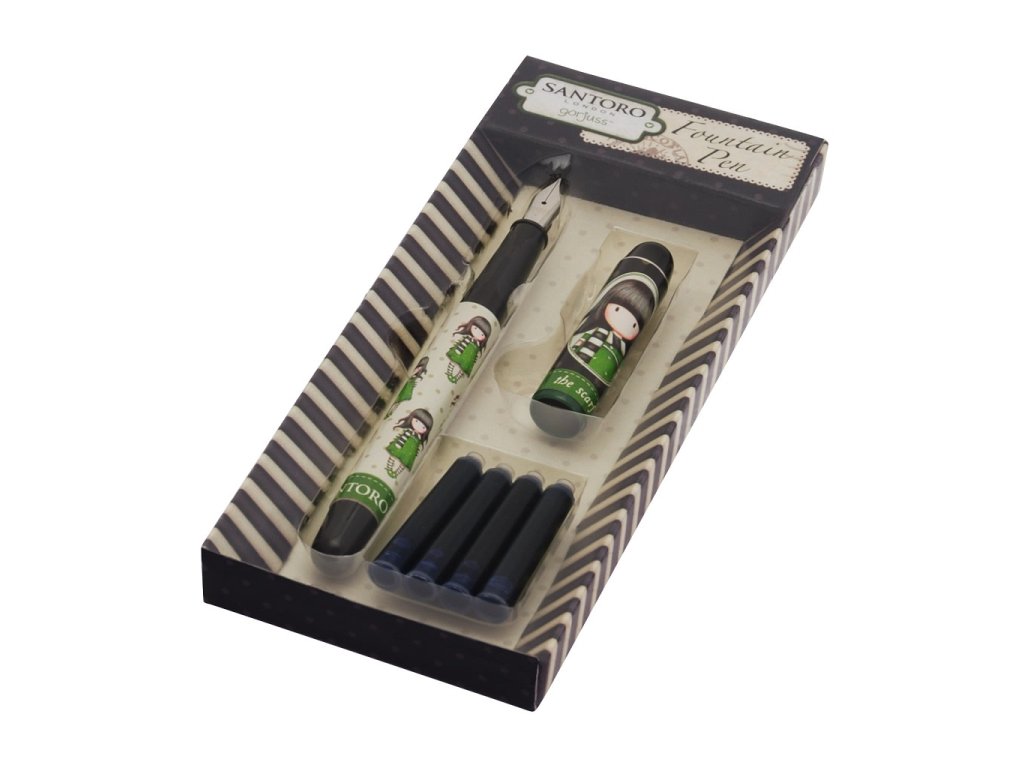 Krásné pero, zdobené obrázkem roztomilé panenky v zelených šatech, jistě potěší malé princezny a učení bude hned veselejší. Pero je velmi příjemné do ruky a jeho kový hrot chrání ochranný kryt. V dárkovém balení jsou také čtyři náhradní inkoustové náplně, modré barvy. Podrobný popis: dárkové balení 1 ks - plnící pero 4 ks - náhradní náplně modré barvy rozměry: 13 x 1 cm Obchodní informace: výrobce: Santoro London kolekce: Gorjuss motiv: The ScarfDoplňkové parametry
