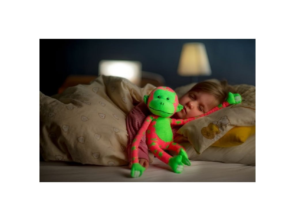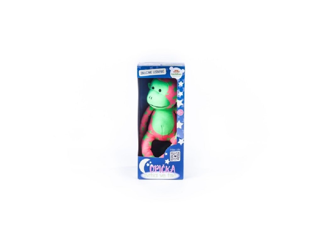 Opička pomůže dětem snadno usnout a klidně spát. V noci svítí jako noční obloha plná hvězd. Když ji postavíte na denní světlo nebo pod lampičku, vydrží ve tmě svítit i několik hodin. Díky suchému zipu jednoduše sepnete ruce i nohy k sobě. Velikost opice: 45 cm. Rozměr krabice: 13,5 x 33,5 x 12,5 cm. Vhodné pro děti od 0 let.Doplňkové parametry