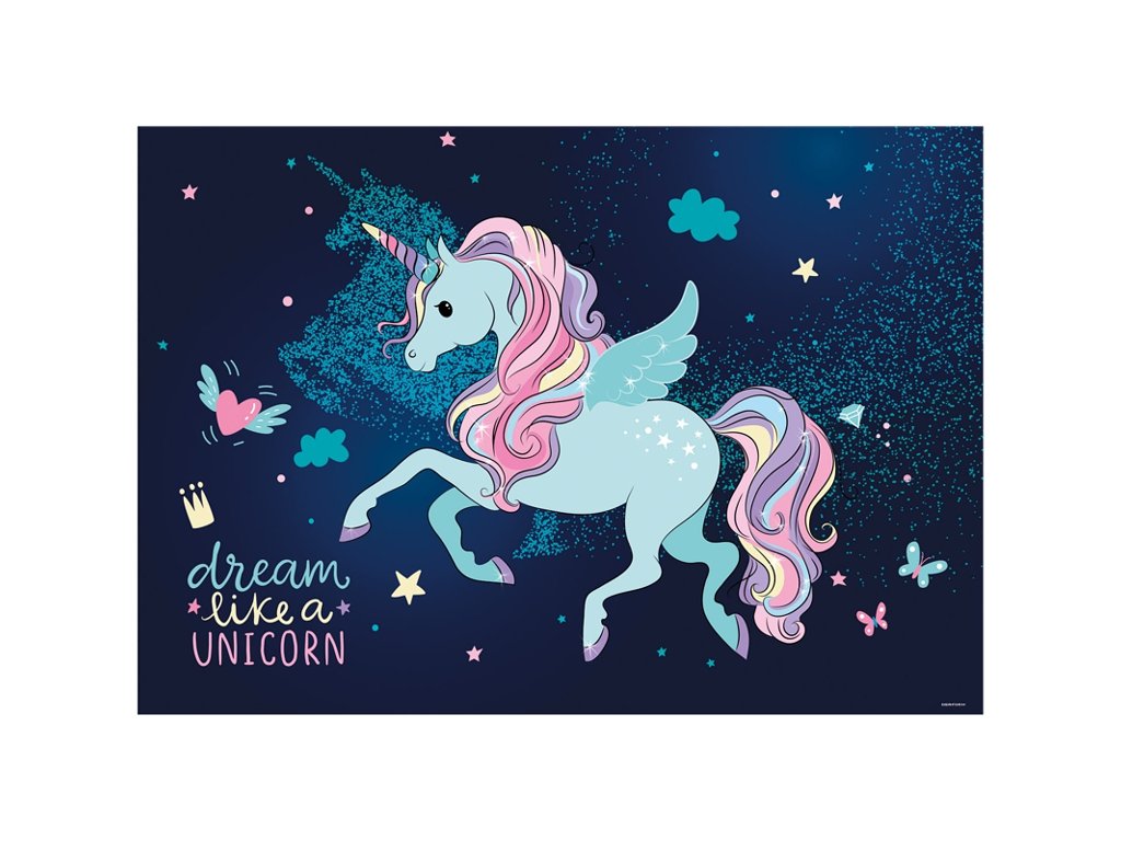 Podložka na stůl s motivem jednorožec z pevného, lesklého kartonu, potisk z obou stran, z každé strany jiný. Dobře se osvědčuje při výtvarných či tvořivých pracích a chrání tak nábytek před poškozením.Rozměry: 49,5 x 34,5 x 0,2 cm. Vhodná pro děti od 3 let.Doplňkové parametry