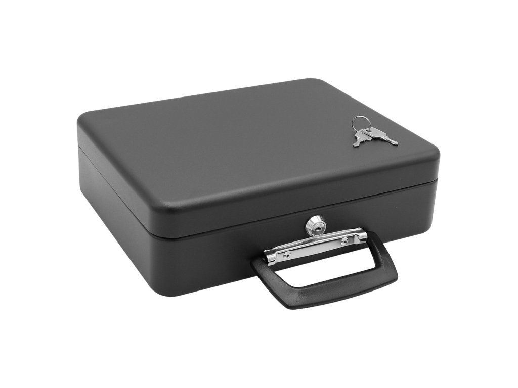 Uzamykatelná pokladnička vyrobená z kvalitní oceli, se sklopným mechanismem na mince.