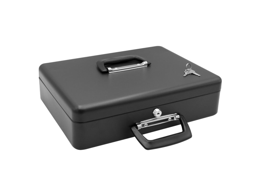 Uzamykatelná pokladnička vyrobená z kvalitní oceli, se sklopným mechanismem na mince.