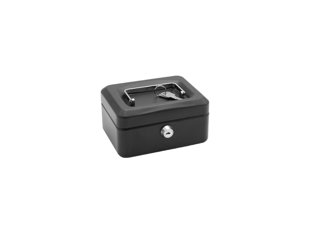 Uzamykatelná pokladnička vyrobená z kvalitní oceli, s vyklápěcím chromovým madlem pro snadné přenášení.