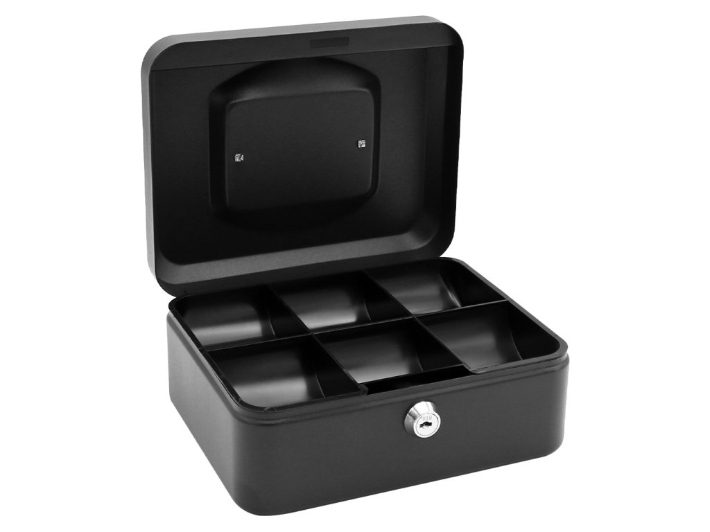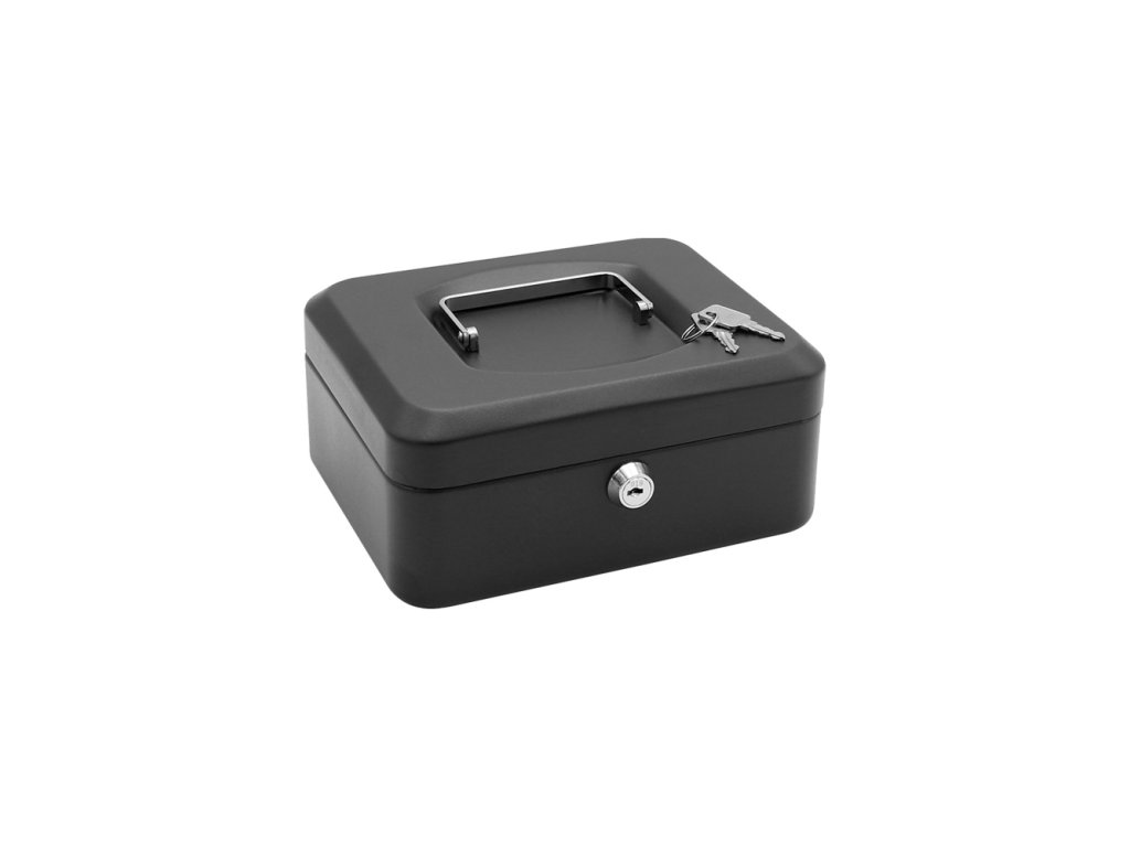 Uzamykatelná pokladnička vyrobená z kvalitní oceli, s vyklápěcím chromovým madlem pro snadné přenášení.