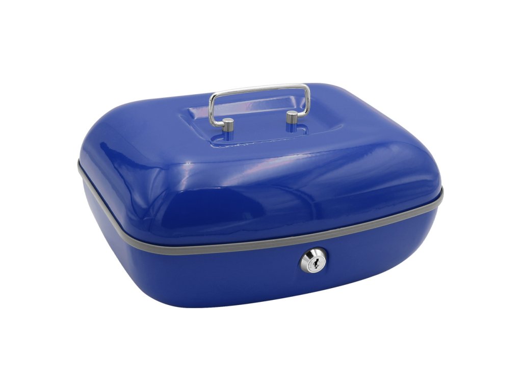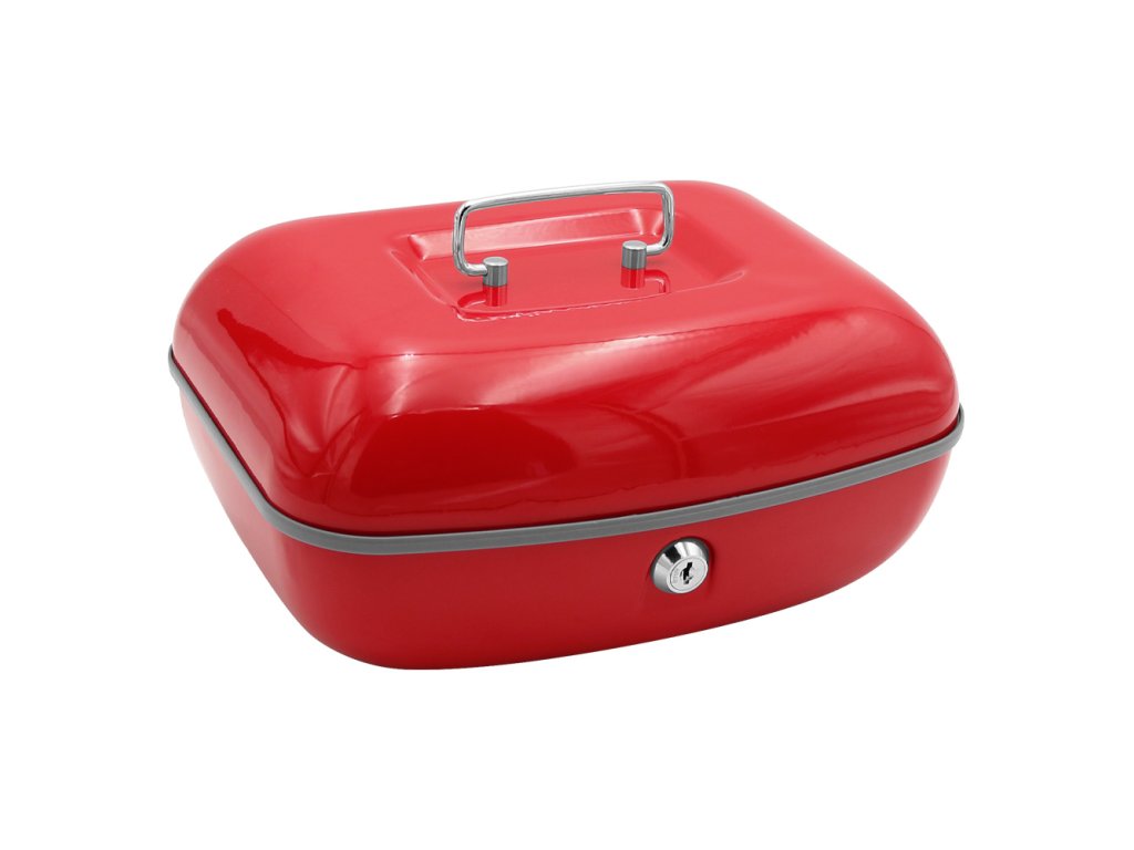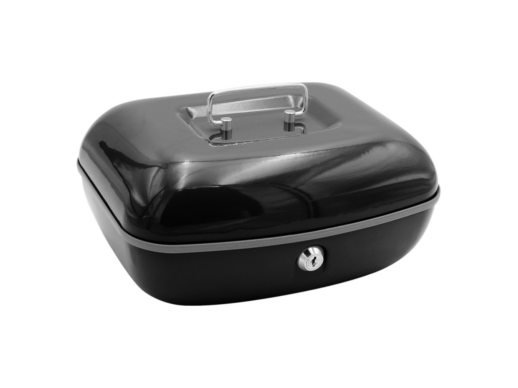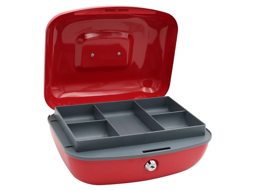 Uzamykatelná pokladnička z kvalitní oceli v moderním designu u s plastovou přihrádkou na mince a 2 klíči. (rozměry: délka 260mm x šírka204 mm x výška 123 mm)Doplňkové parametry