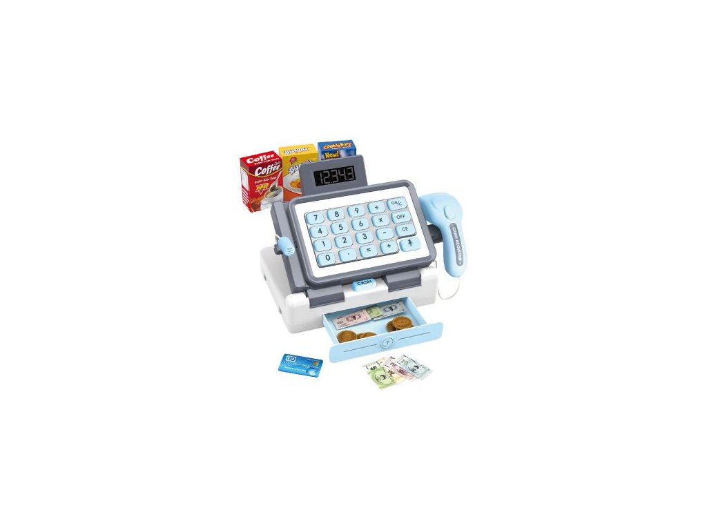 Pokladna s efekty modrá. Velikost 25x15x18,5 cm. Funkce kalkulačky, mikrofon, otevírací šuplík na peníze. Baterie 3xAA nejsou součástí.Doplňkové parametry
