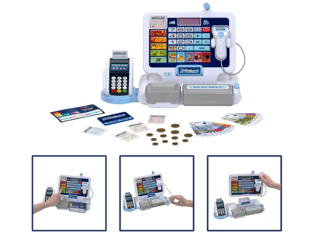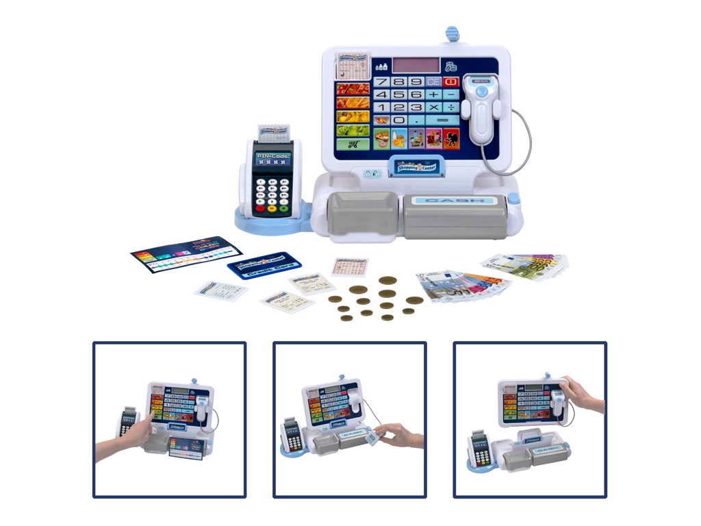 Pokladna s platebním terminálem a odnímatelným tabletem. Obsahuje Elektronický displej, zvukové efekty, funkce kalkulačky, skener se zvukem a výklopná peněžní přihrádka s tlačítkem. Obsahuje tyto doplňky: mince, bankovky, 6 příjmových karet a 1 kreditní kartu. Baterie nejsou součástí balení. Vhodné od 3 let.Doplňkové parametry